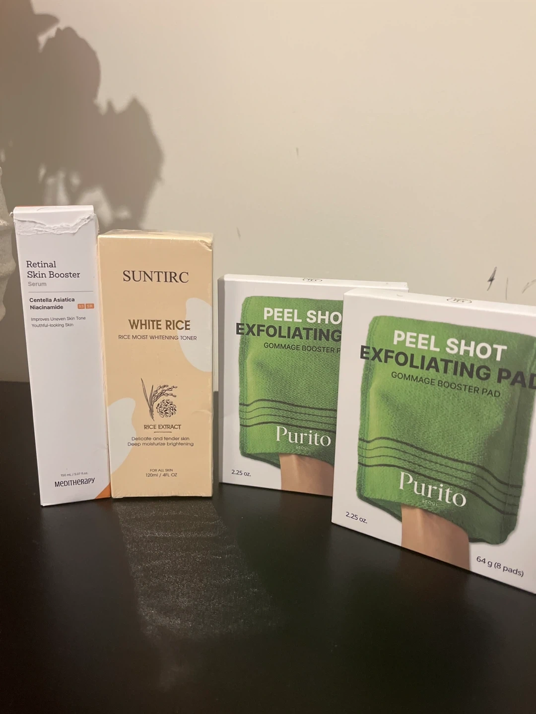 This bundle includes Purito Peel Shot Exfoliating Gommage Booster Pads and Medi-Therapy Retinal Skin Booster Serum. The Purito pads contain 8 pads, weighing 64g. The Medi-Therapy serum is 150ml. The SUNTIRC White Rice Toner is also included, a 120ml bottle.