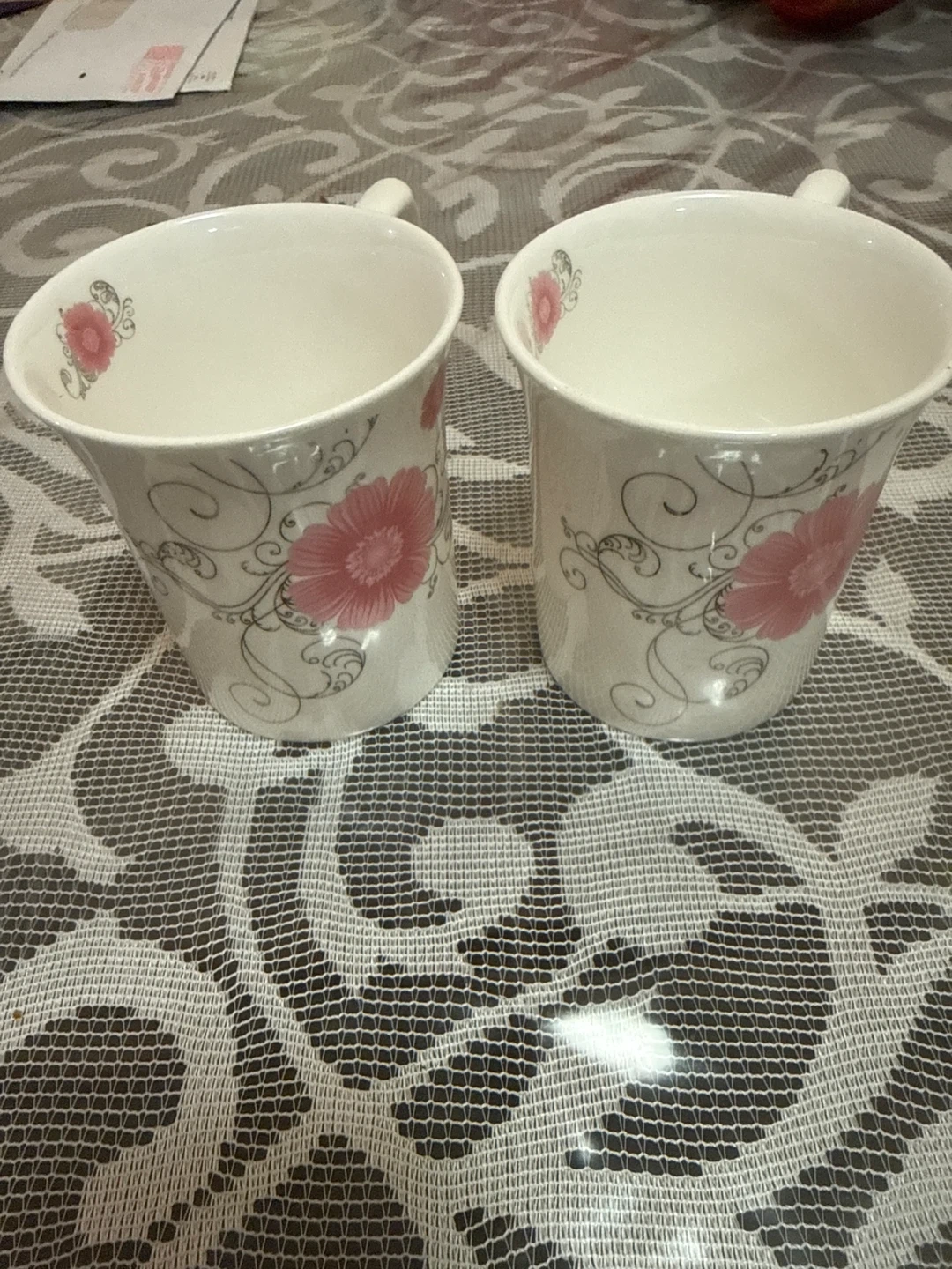 Here's a set of two mugs with a pretty floral design. They're perfect for enjoying your morning coffee or tea!