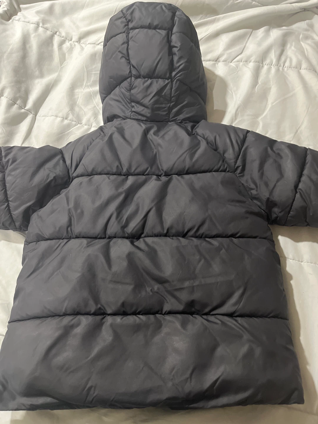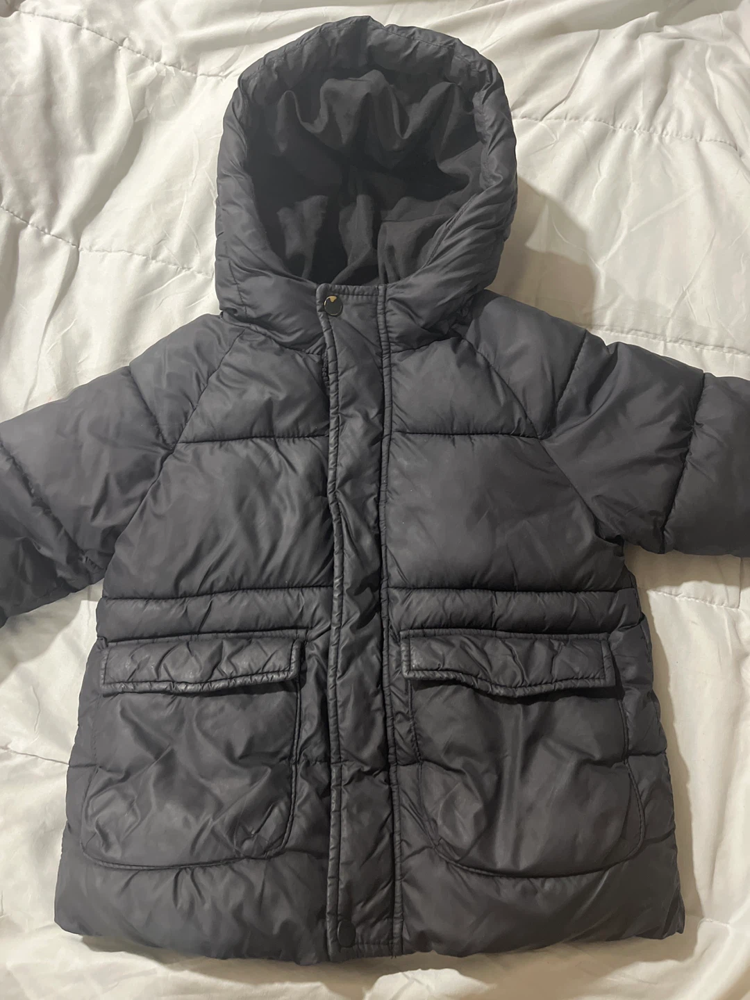 Grey puffer jacket from Zara. Features a hood and two front pockets. Size is 3-4 years, or 104cm. Made in Bangladesh.