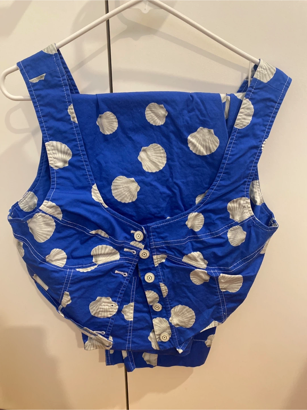 This is a cute Nocturne vest and pants set. It features a blue fabric with a white shell print. The set is in great condition and ready for a new home!