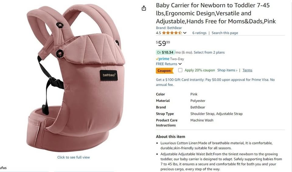 NEW~ Baby Carrier, Adjustable Cotton-Linen, 7β45 lbs