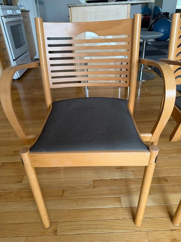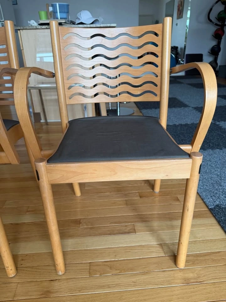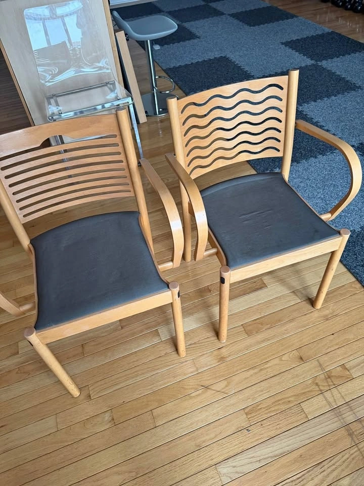 Moving sale! Selling a pair of solid wood accent chairs with original upholstery. One chair has a straight-line slatted back, and the other features a curved, wavy-line back design. Both have beautifully shaped wood frames, curved arms, and a modern studio look. They are very solid and well-built. The original upholstery is in good condition and can be easily reupholstered if you wish to customize. Selling as a pair only.