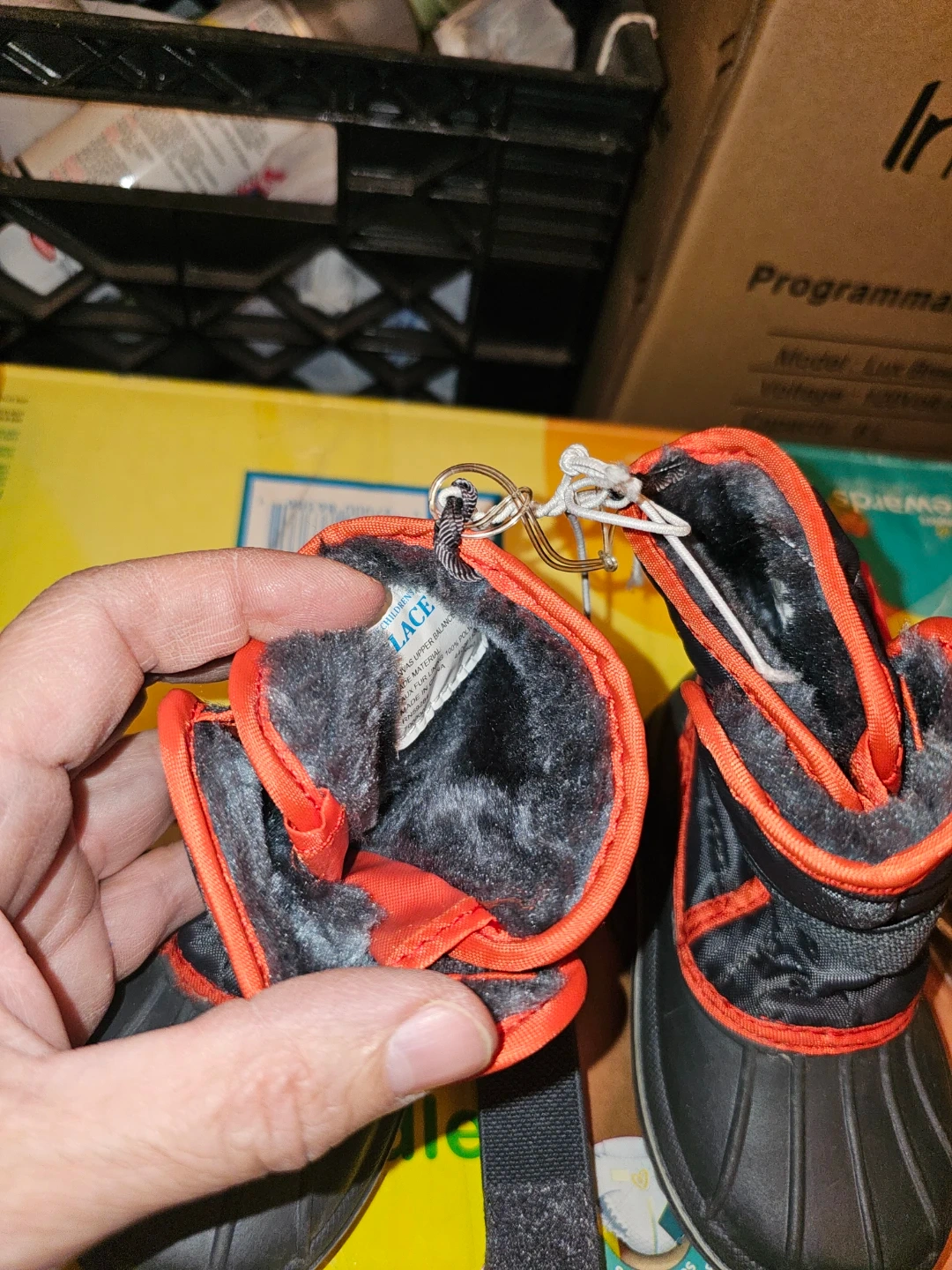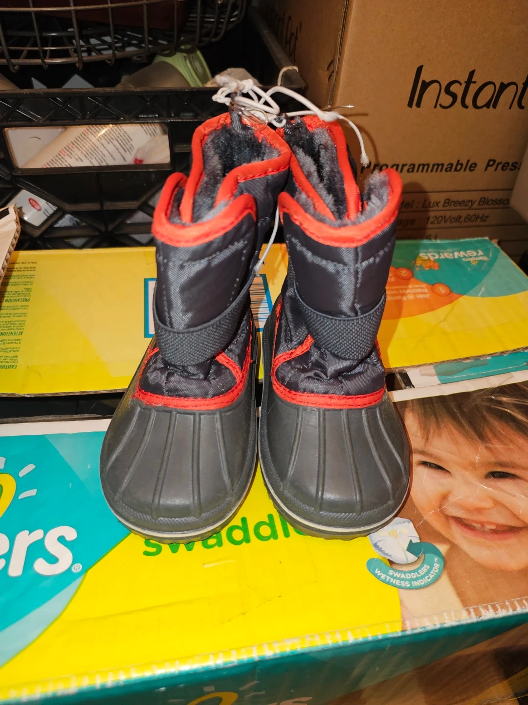 These Children's Place winter boots are black and gray with red accents. They're insulated for warmth and have a durable rubber sole. Perfect for keeping little feet warm and dry in cold weather!
