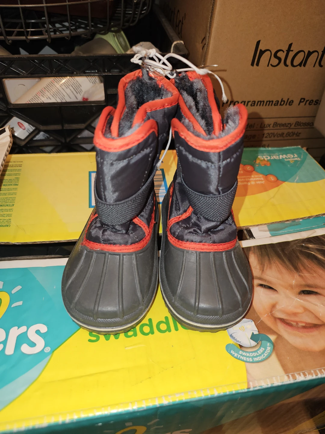 These Children's Place winter boots are black and gray with red accents. They're insulated for warmth and have a durable rubber sole. Perfect for keeping little feet warm and dry in cold weather!