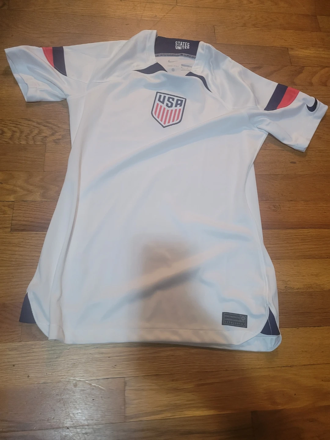 Selling a Nike USA soccer jersey in size L. It's white with red and navy accents. The jersey features the USA crest on the front. It is made with Nike's Dri-FIT technology.
