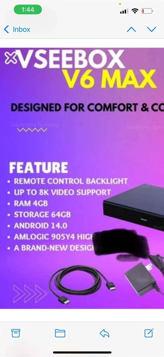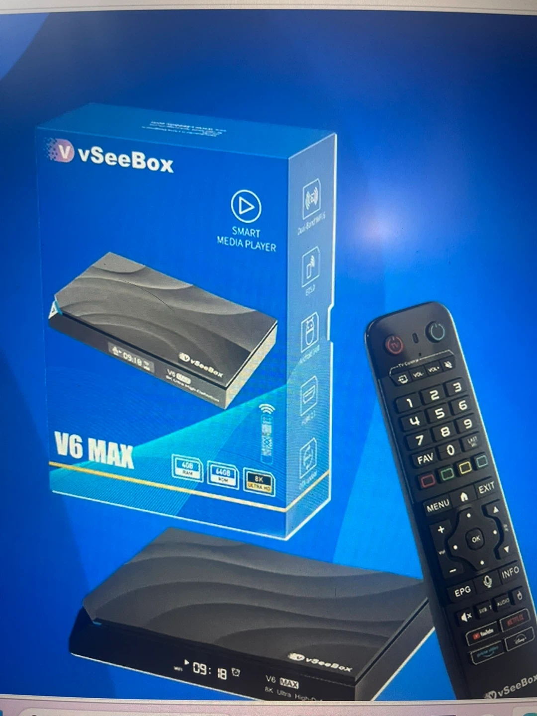 This vSeeBox V6 MAX is a smart media player. It features 8K video support, 4GB RAM, and 64GB storage. It runs on Android 14.0 and uses Amlogic 905Y4 high-end chips. It comes with a remote control, power adapter, and HDMI cable. Full 1 year warantee. View all live channels, thousands of movies and series. A sports lovers dream!!