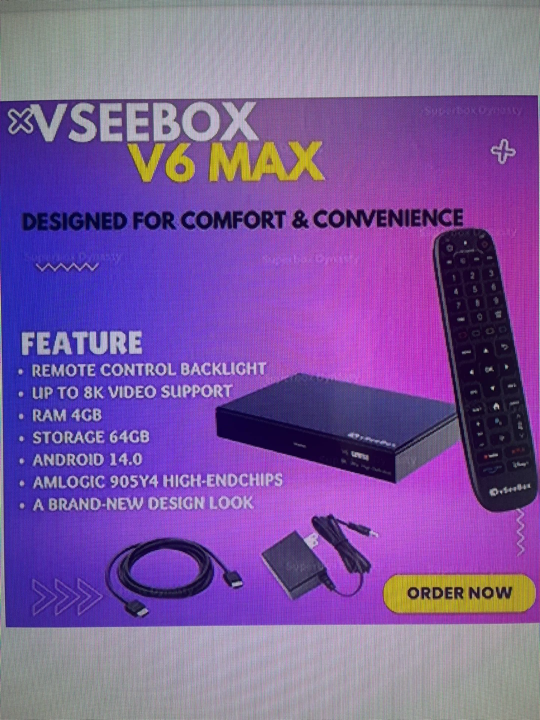 This vSeeBox V6 MAX is a smart media player. It features 8K video support, 4GB RAM, and 64GB storage. It runs on Android 14.0 and uses Amlogic 905Y4 high-end chips. It comes with a remote control, power adapter, and HDMI cable. Full 1 year warantee. View all live channels, thousands of movies and series. A sports lovers dream!!