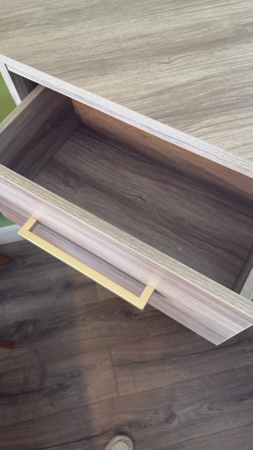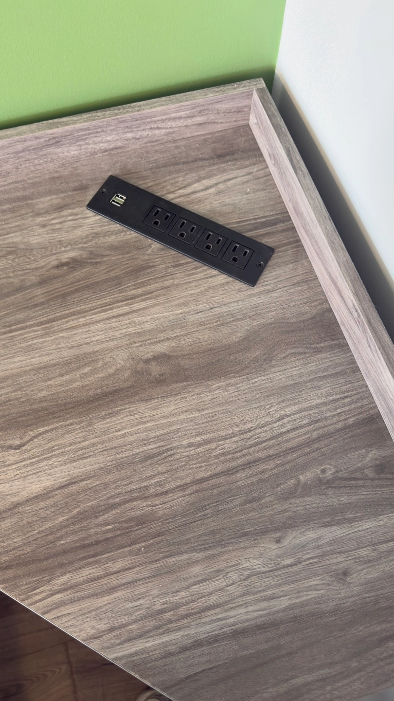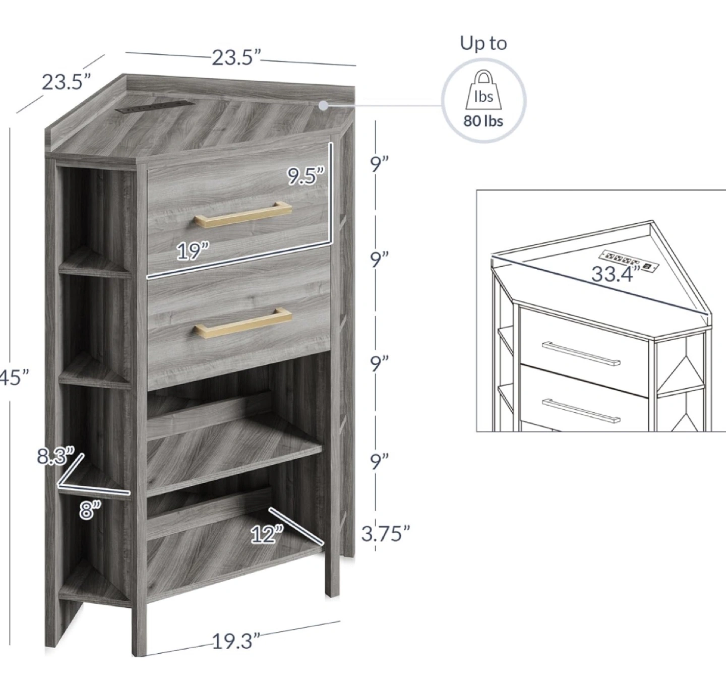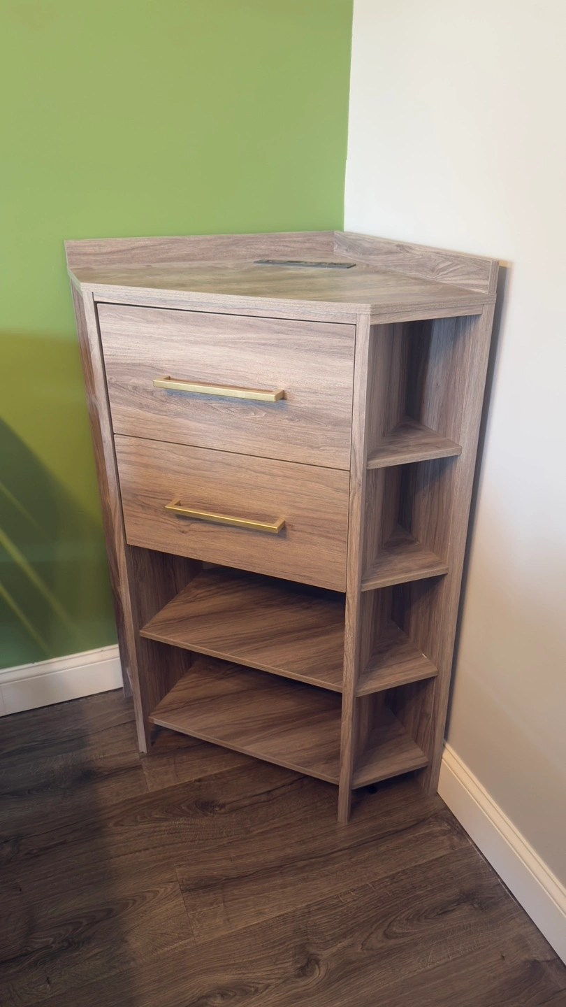 Corner cabinet, gray wood finish. Two drawers, gold handles. Open shelving. Built-in power strip. Perfect for small spaces. Fully assembled.