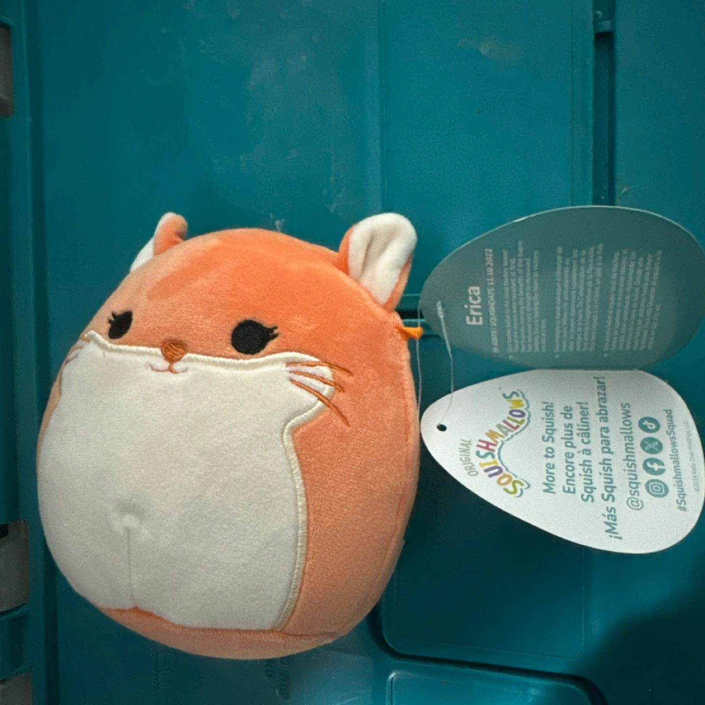 This is a Squishmallow plush toy named Erica. It's orange and white with black eyes and stitched whiskers. This soft, huggable plush is made for snuggles!