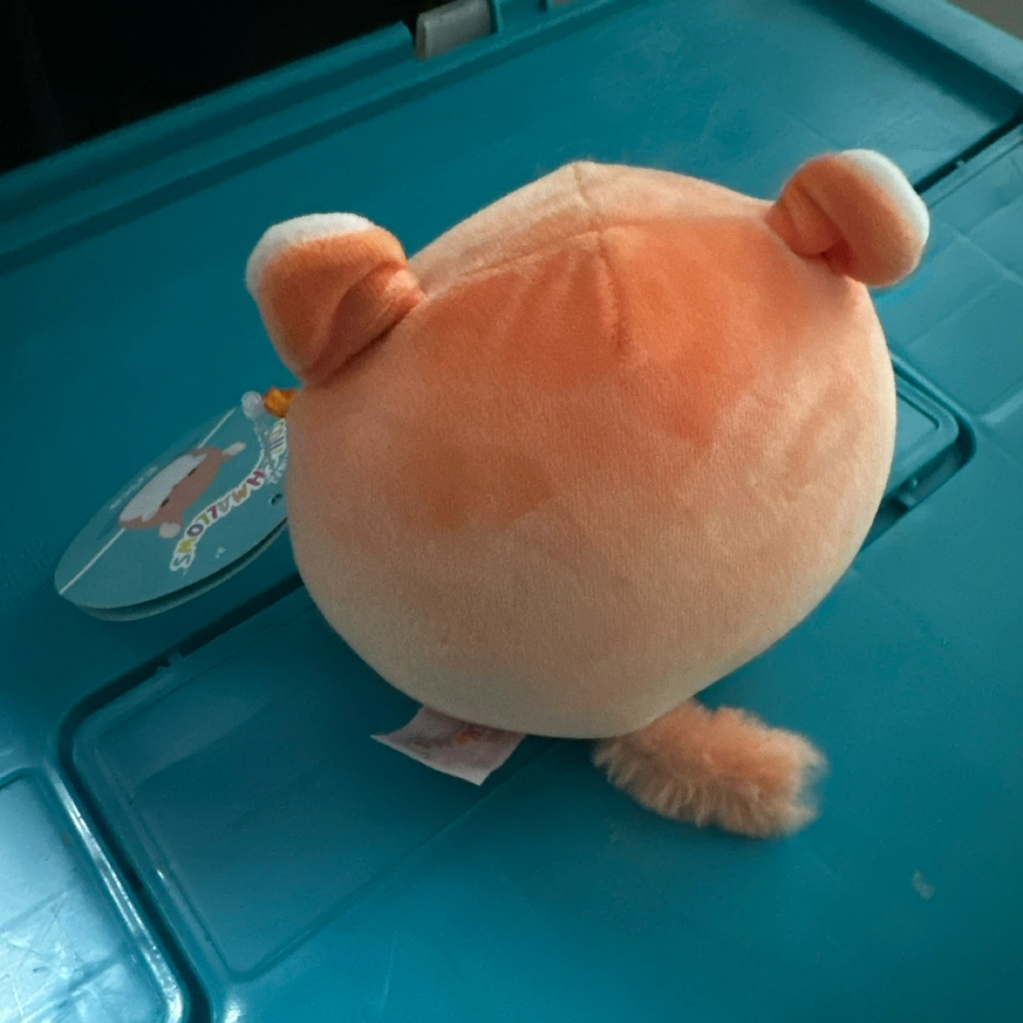 This is a Squishmallow plush toy named Erica. It's orange and white with black eyes and stitched whiskers. This soft, huggable plush is made for snuggles!