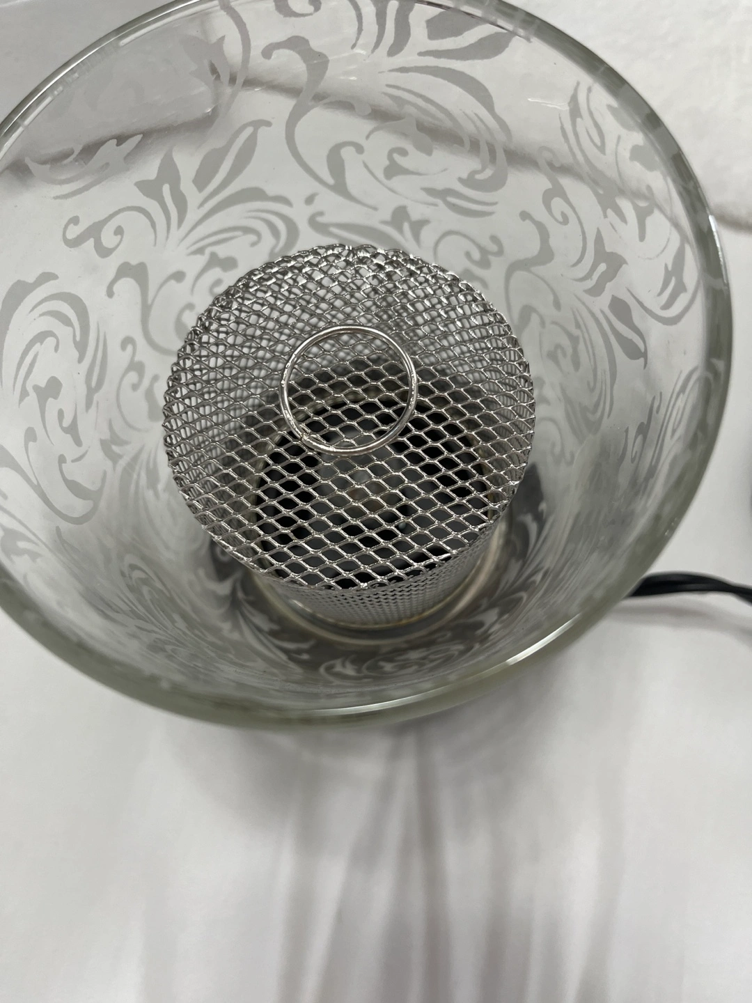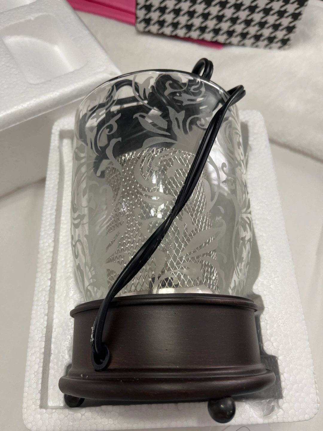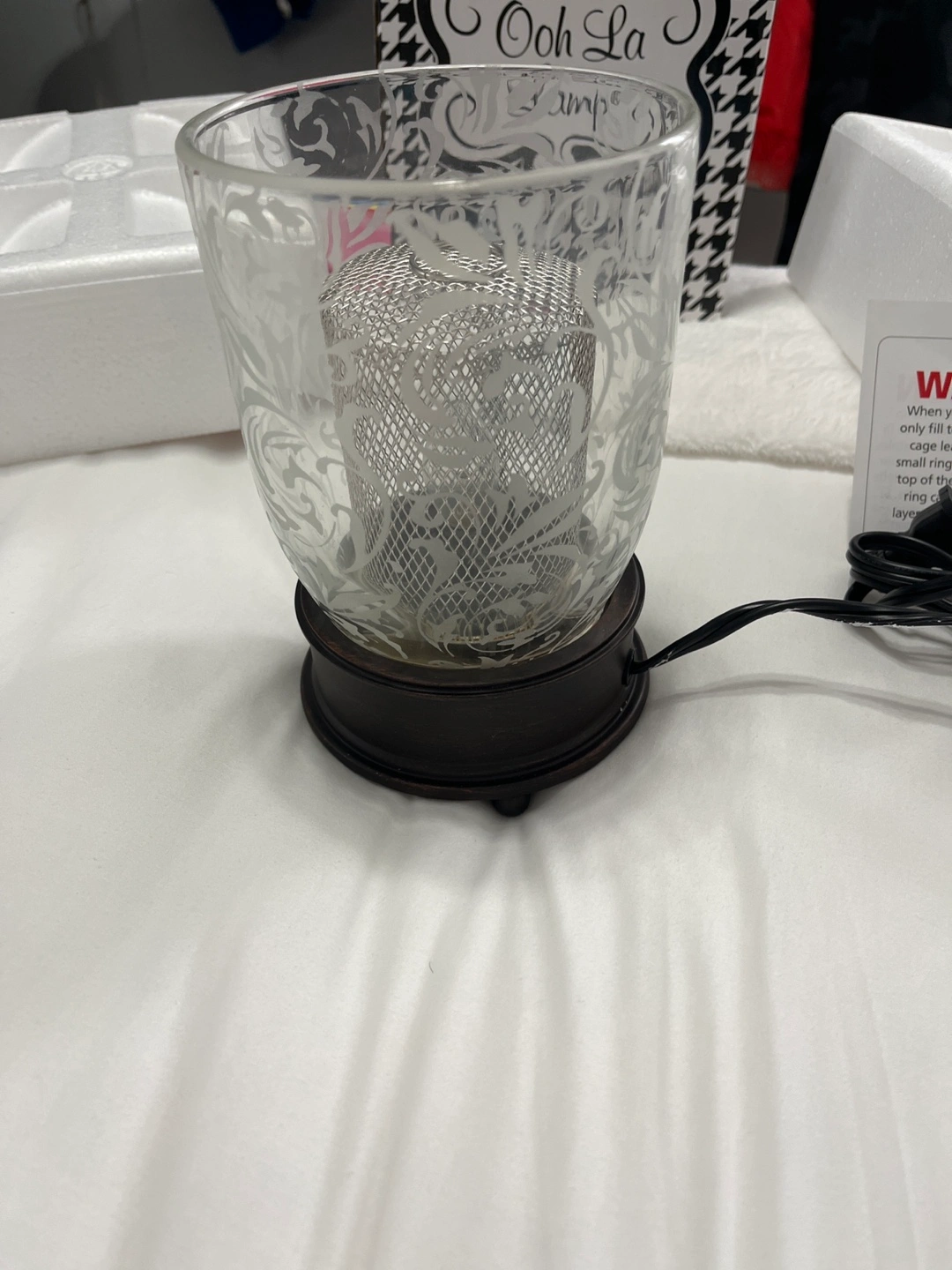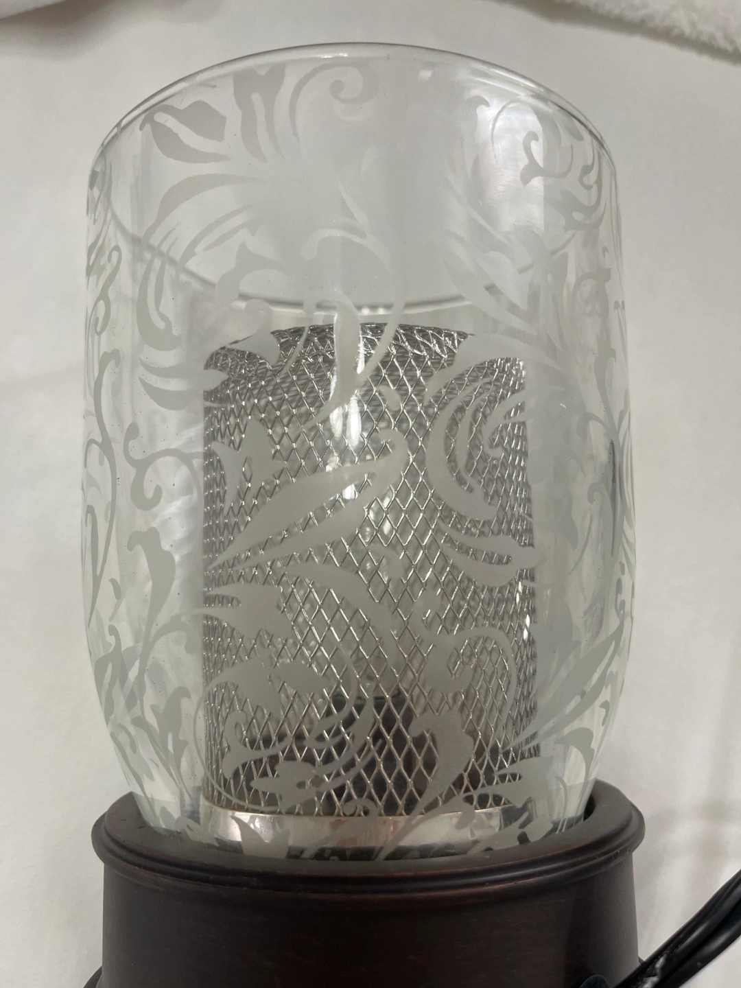 Electric wax warmer with glass shade. Includes a metal mesh insert. Cord included. Brand new never used. Will include a bag of scented beads.