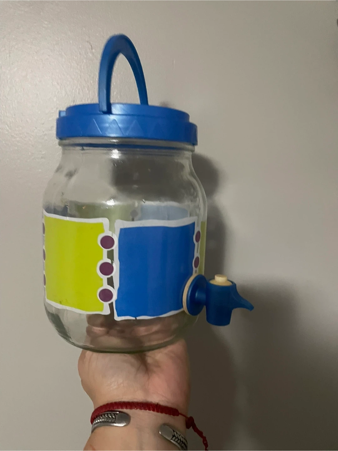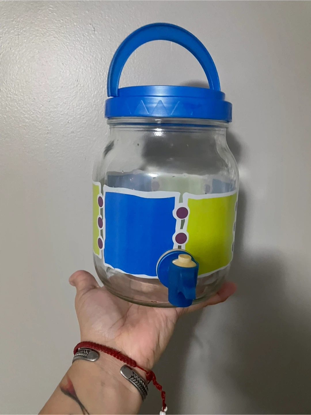 Here's a glass beverage dispenser with a spigot! It's perfect for parties or everyday use. It's in great condition and ready to use for your favorite drinks