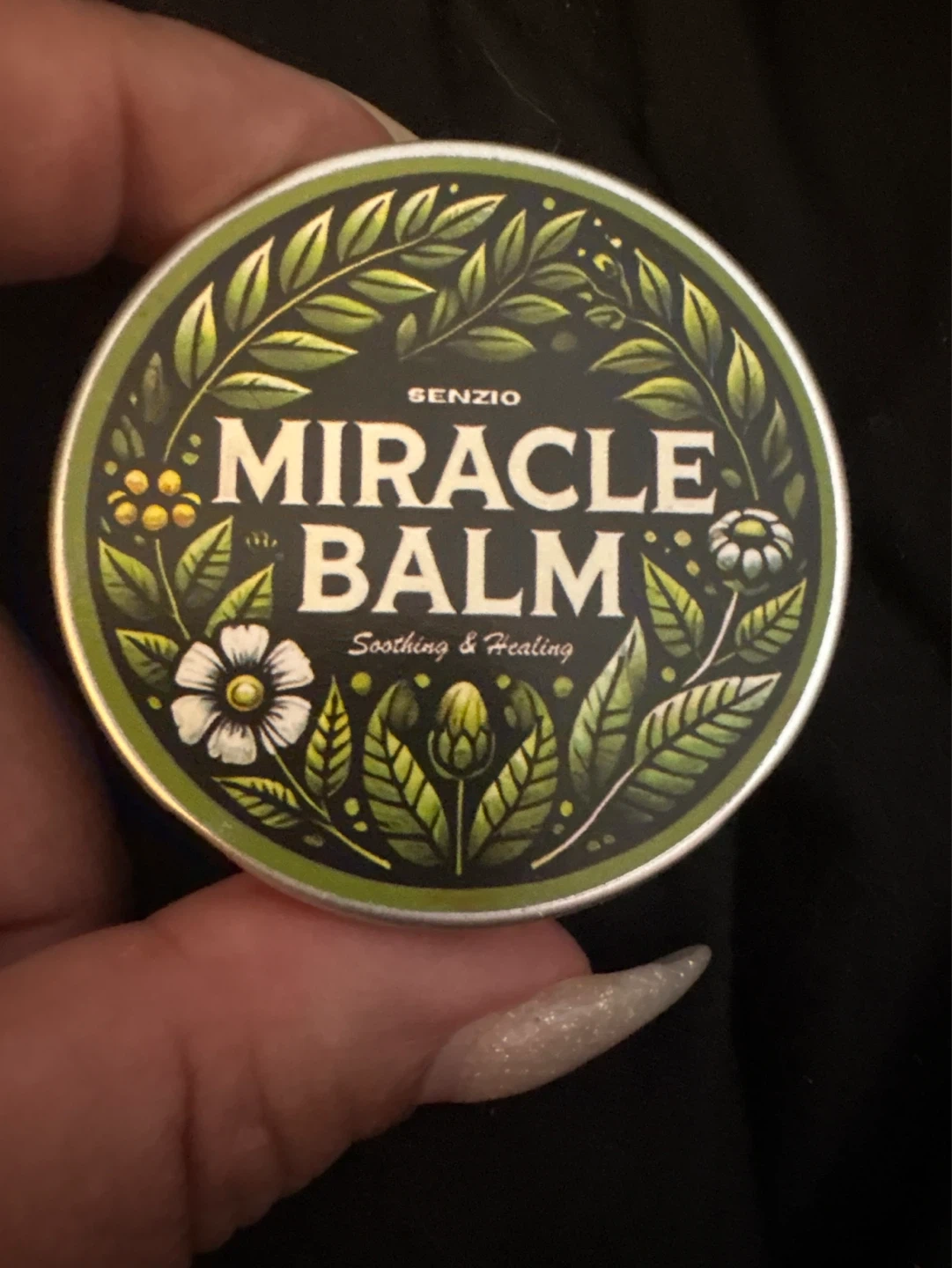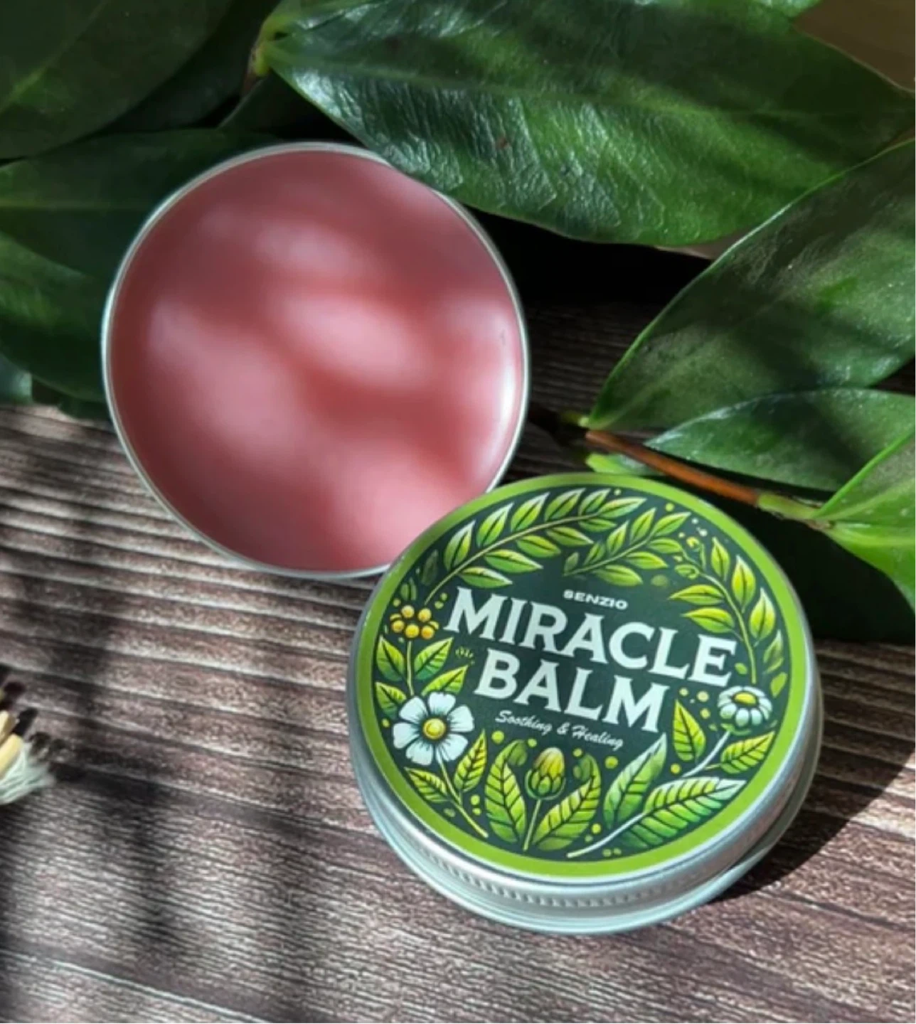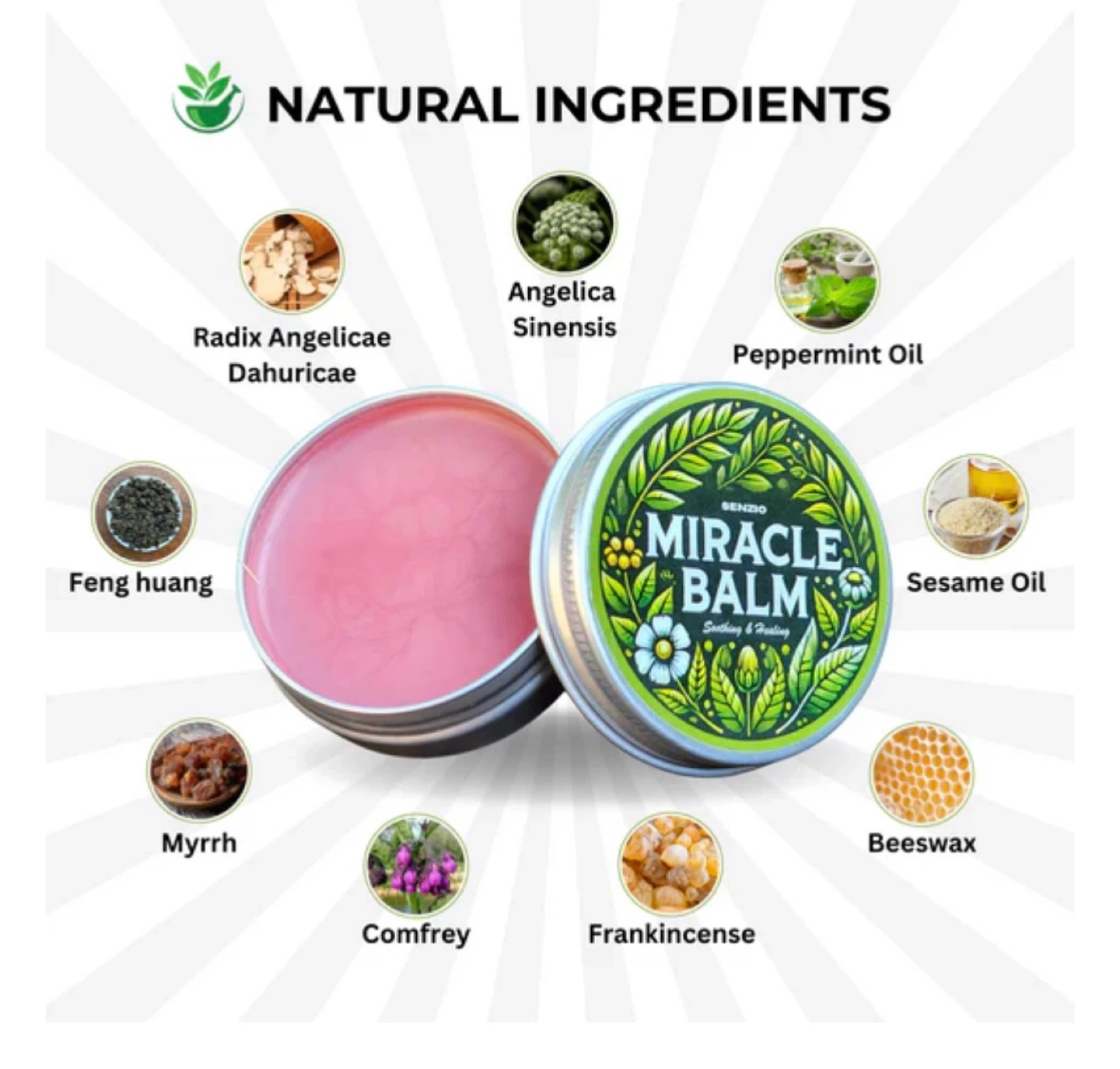 Senzio Miracle Balm tin for soothing and healing. Features natural ingredients like Angelica Sinensis, Peppermint Oil, Myrrh, Comfrey, Frankincense, Beeswax, and Sesame Oil. Ideal for skin application. New retail price $35.00