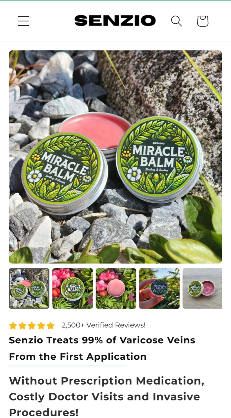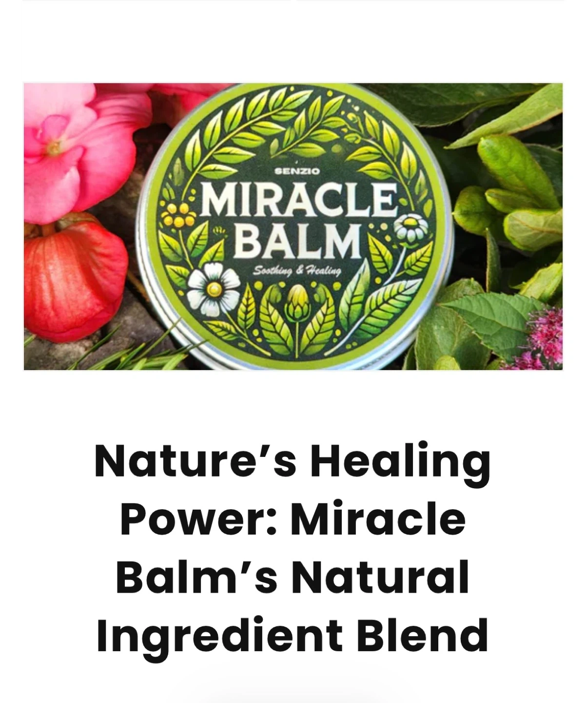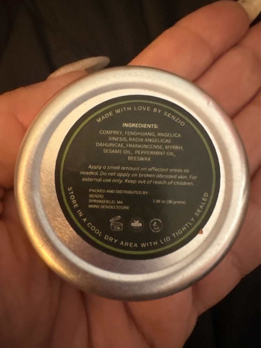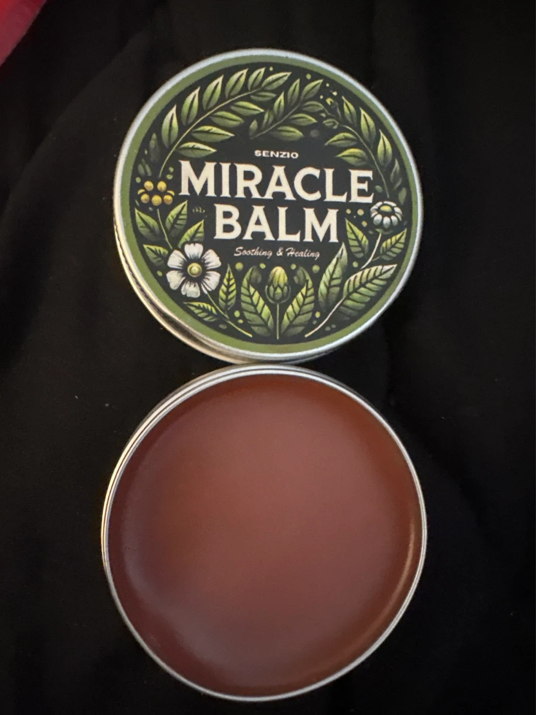 Senzio Miracle Balm tin for soothing and healing. Features natural ingredients like Angelica Sinensis, Peppermint Oil, Myrrh, Comfrey, Frankincense, Beeswax, and Sesame Oil. Ideal for skin application. New retail price $35.00