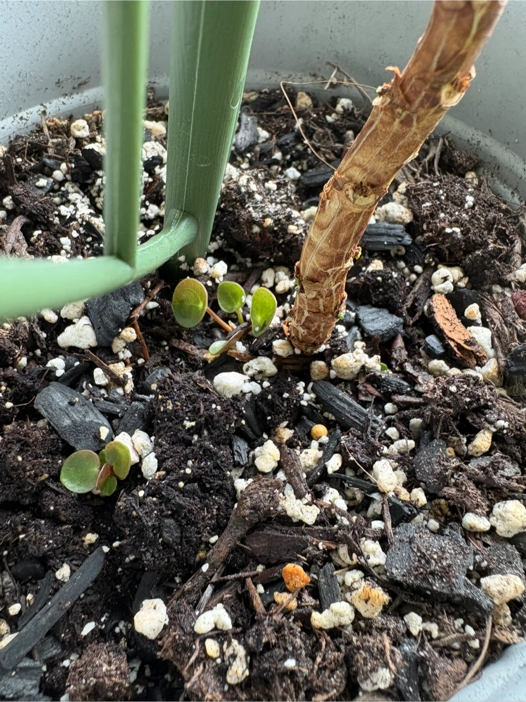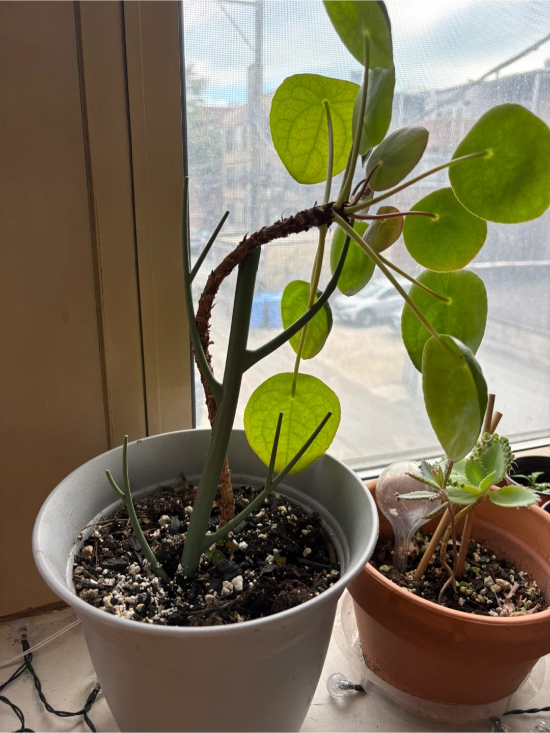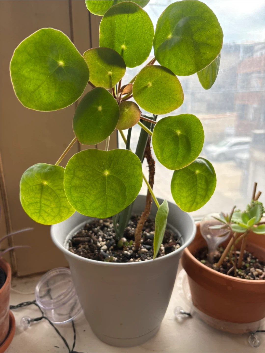 Pilea plant. It has a long stem.. probably isn’t getting enough direct sunlight at my place. Last pic shows pups it’s already growing. Comes with pot/ without support stick.
