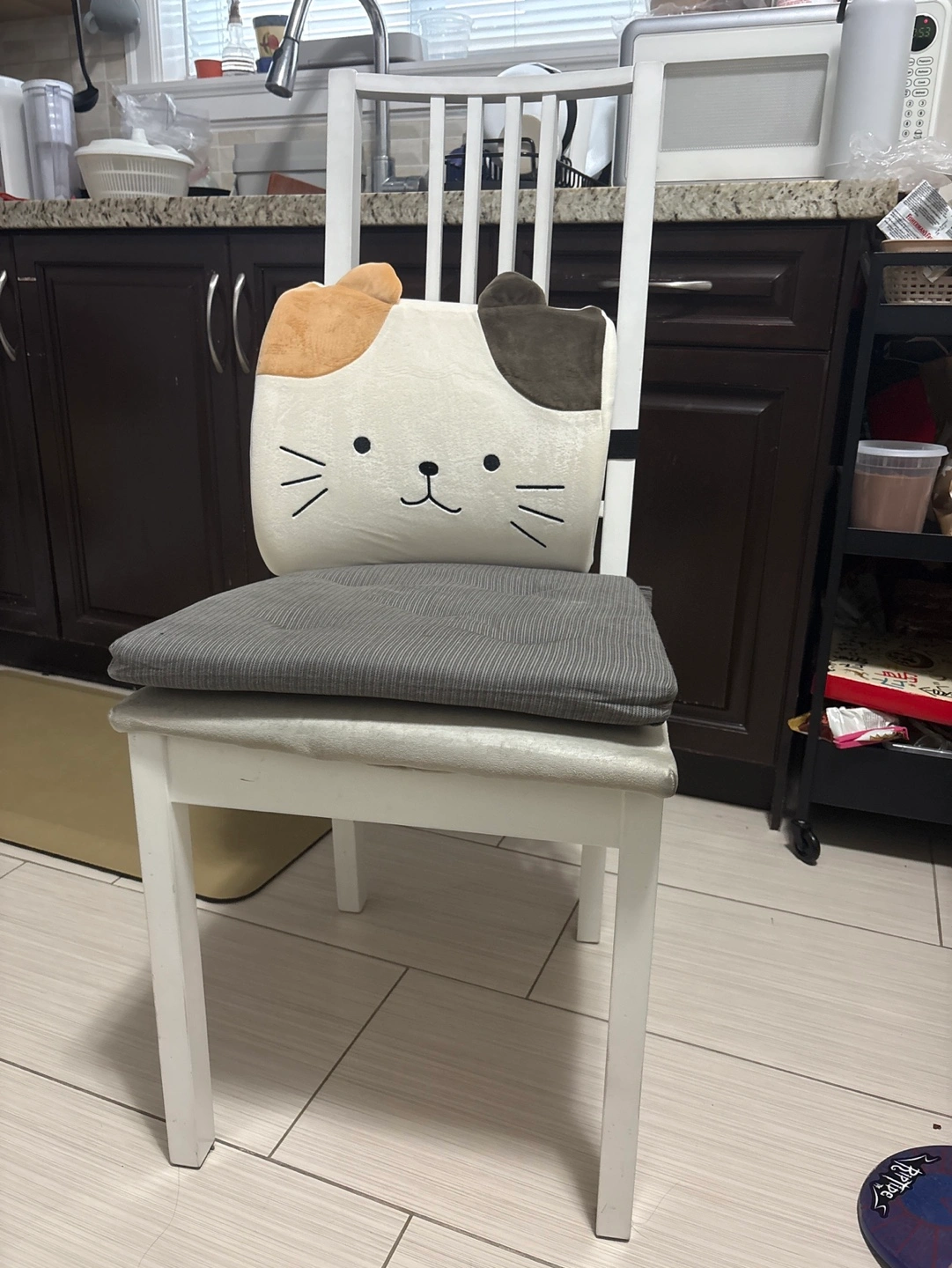 White wooden chair with grey chair pad. Features a cute cat-shaped lumbar cushion. Perfect for adding comfort and style to your kitchen or dining area.