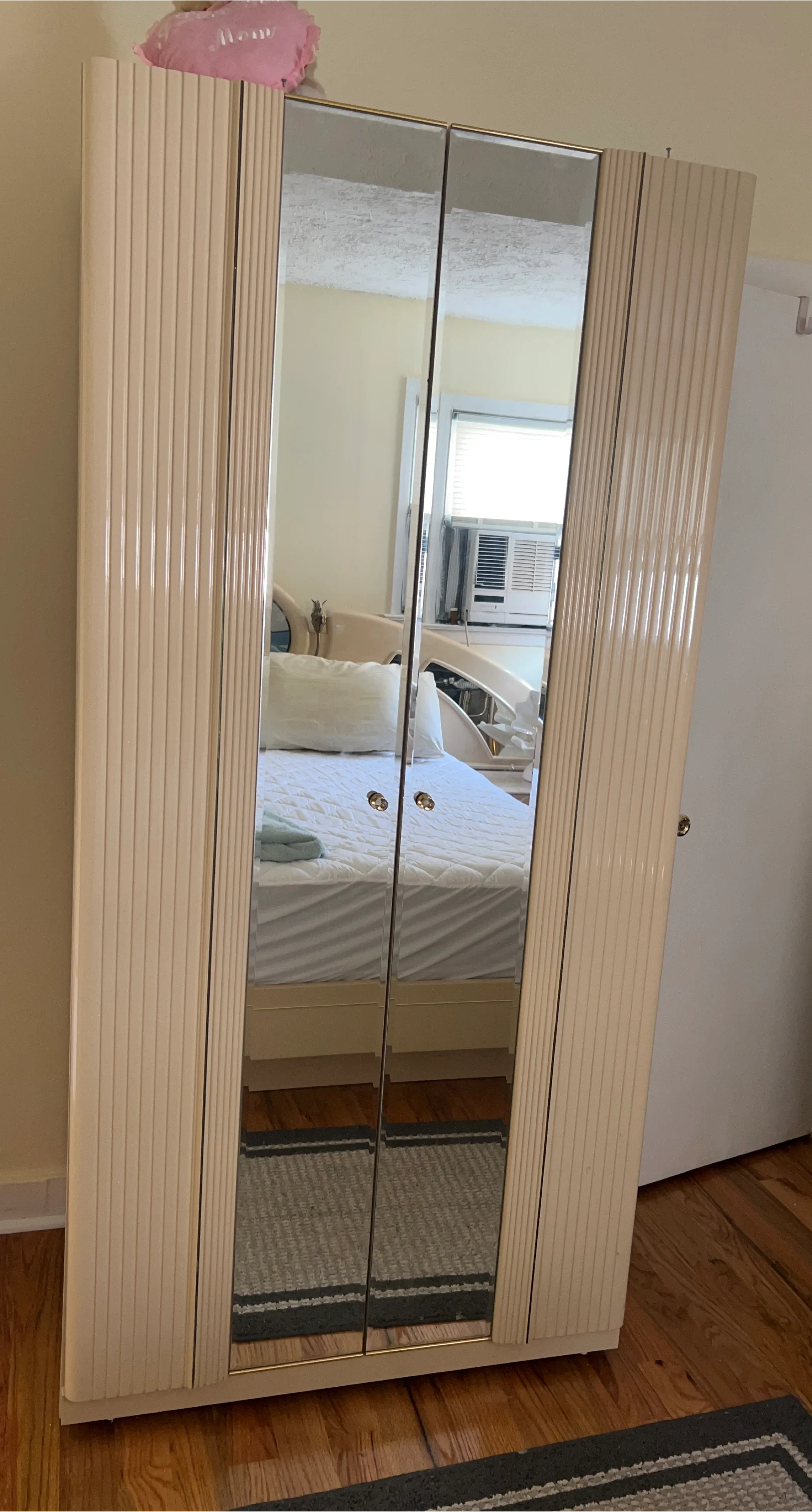 Selling a wardrobe with mirrored doors. It's in good condition and offers ample storage space! The wardrobe has a cream color and a vertical ribbed design on the doors