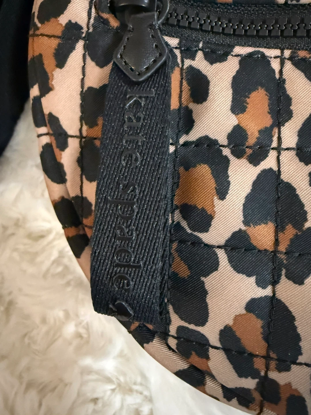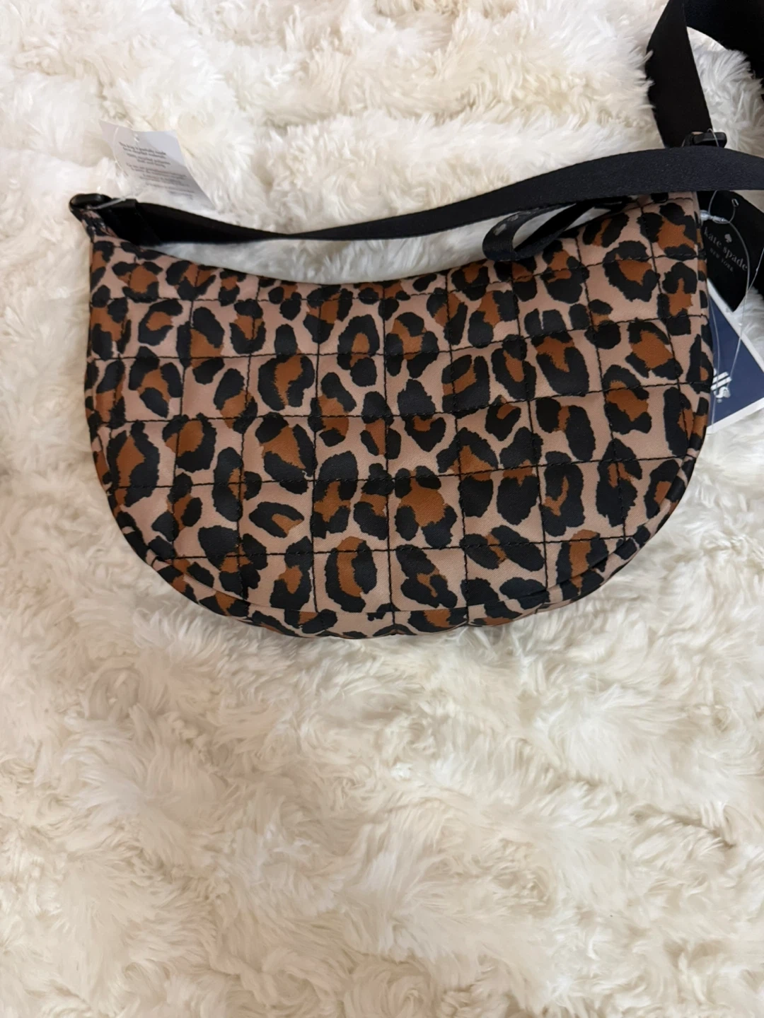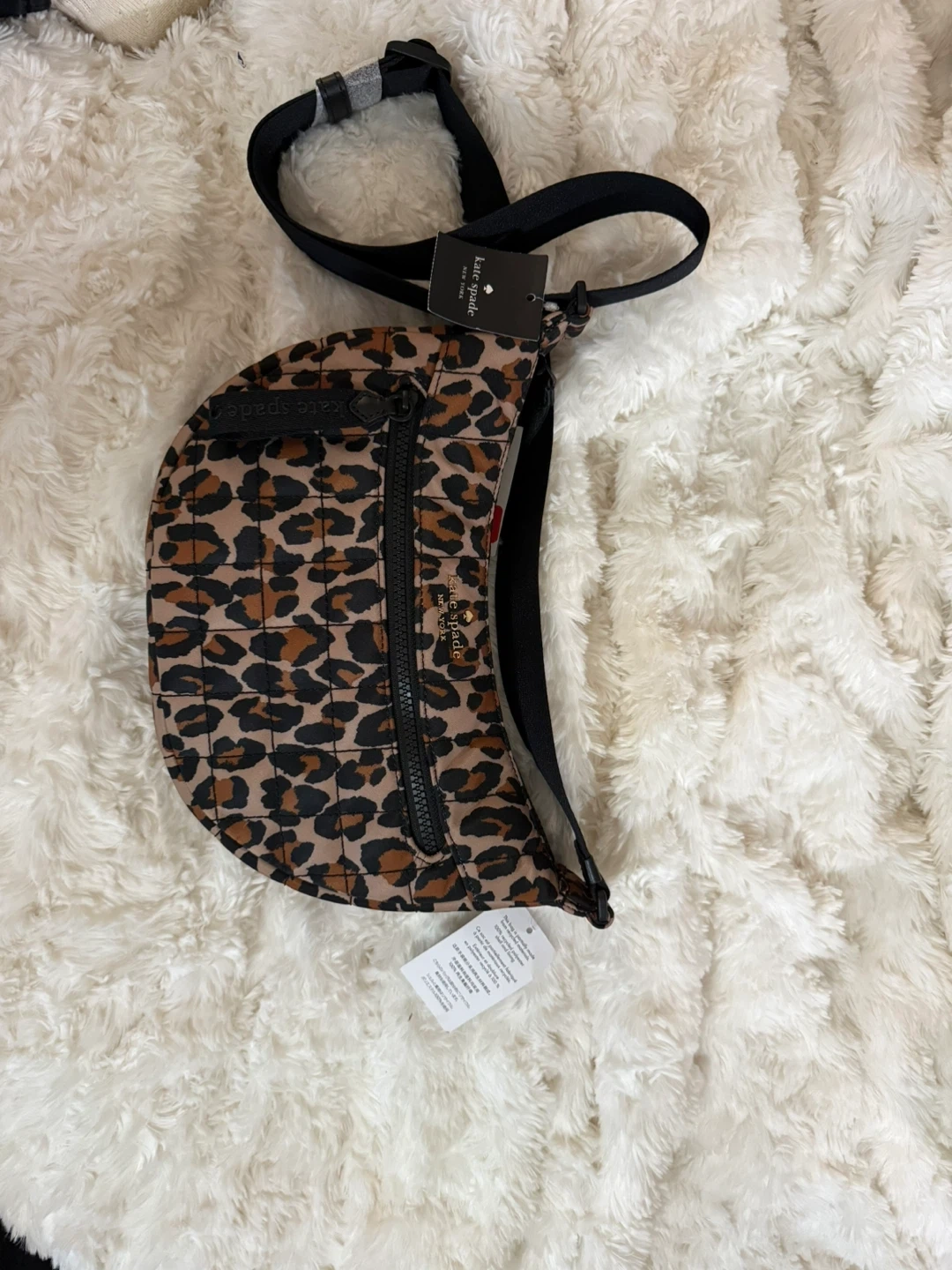 This quilted Kate Spade New York bag features a fun leopard print. It's designed to be worn as a fanny pack or a crossbody bag. This accessory's stylish design makes it a great addition to any outfit!