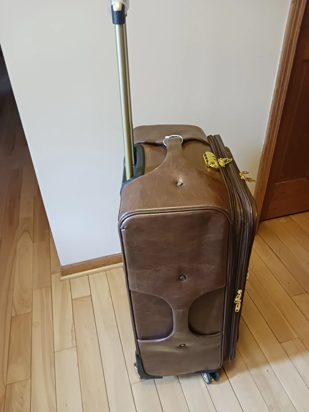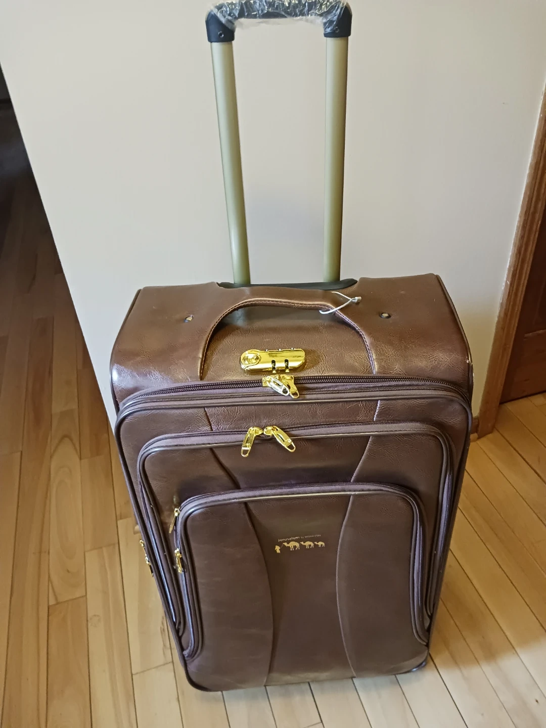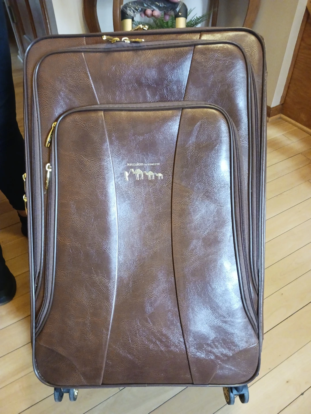 Jesusalem leather luggage suitcase. This item measures approximately 24 inches tall and 20 inches wide. It has gold-tone hardware and a retractable handle. Two wheels are present for easy transport.