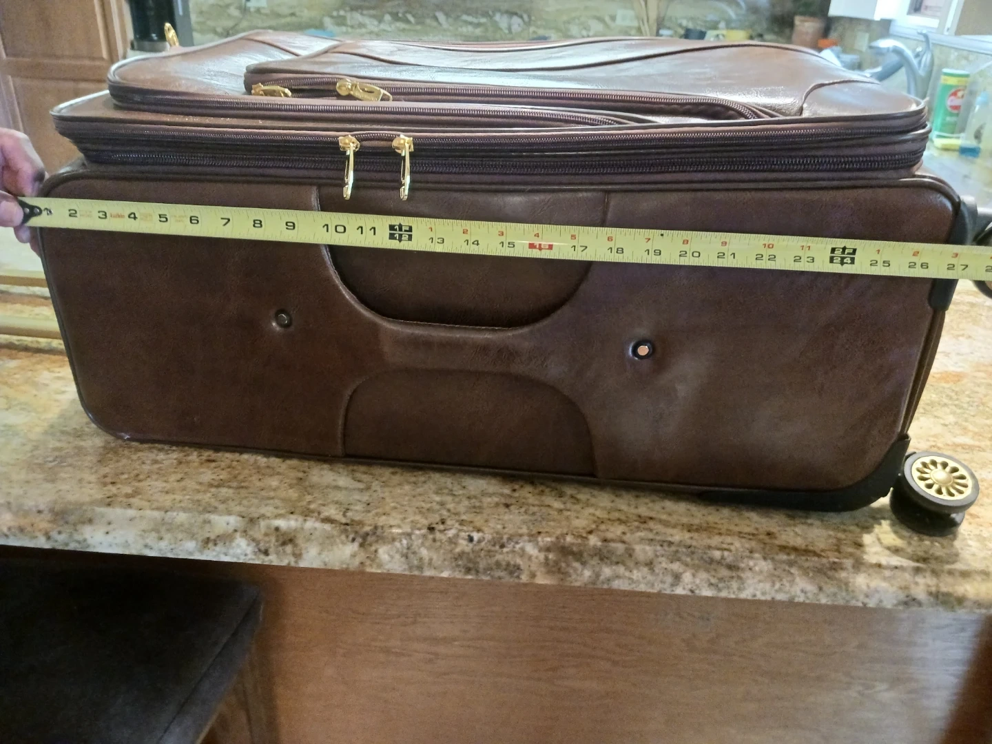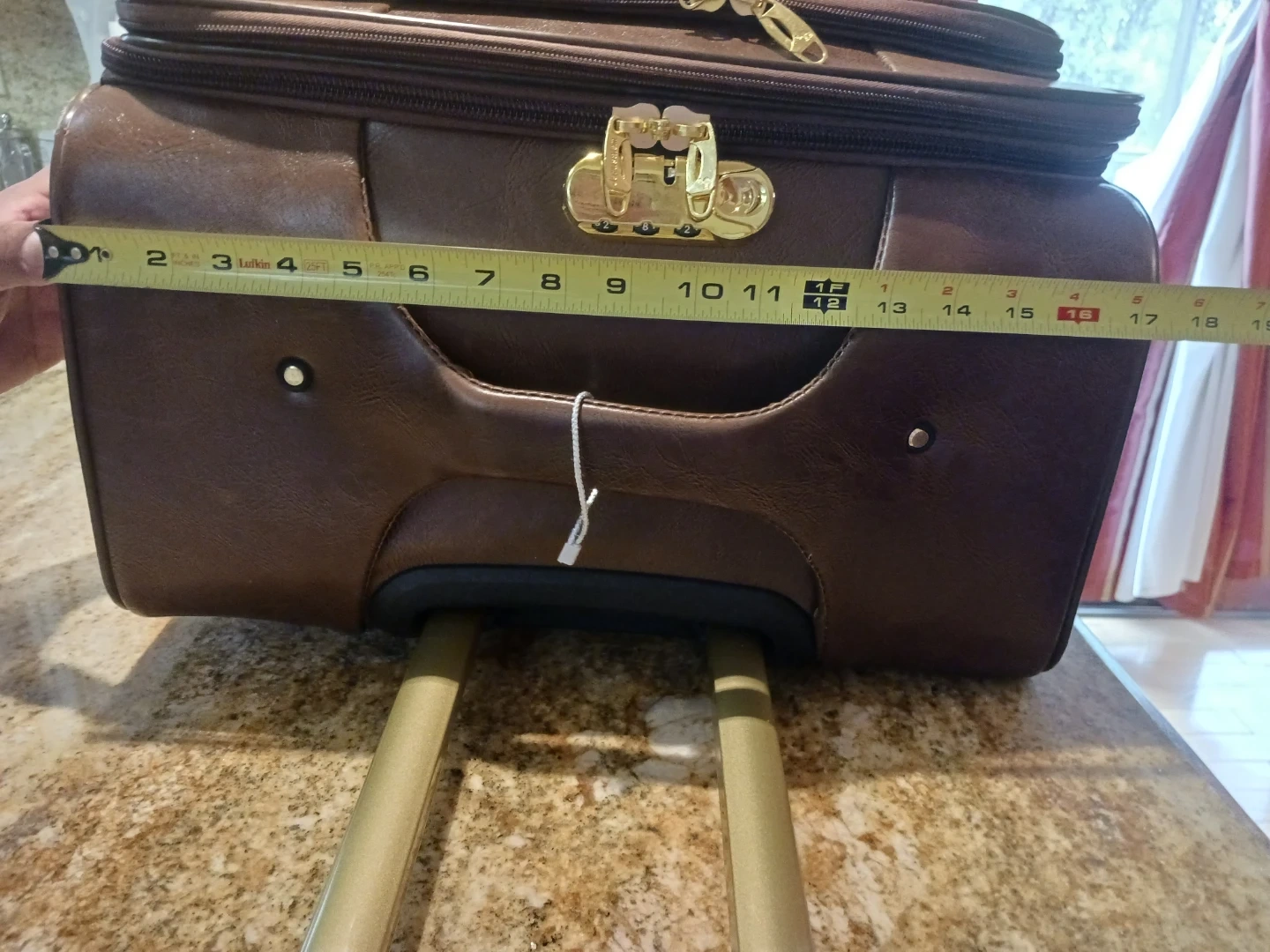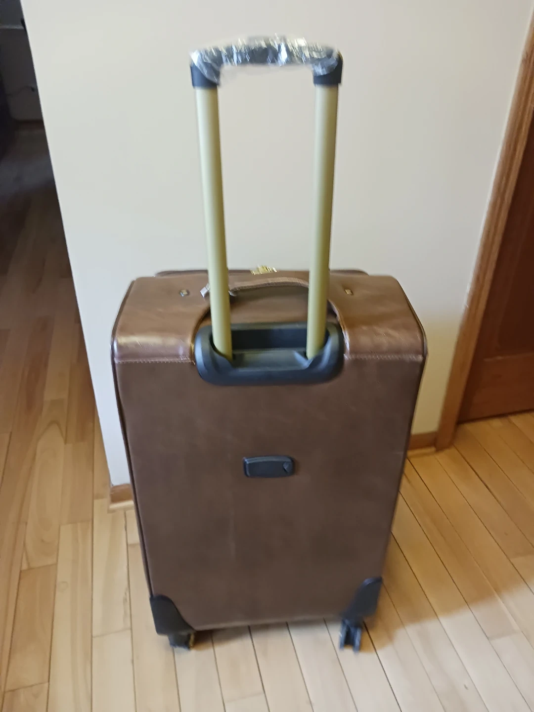 Jesusalem leather luggage suitcase. This item measures approximately 24 inches tall and 20 inches wide. It has gold-tone hardware and a retractable handle. Two wheels are present for easy transport.