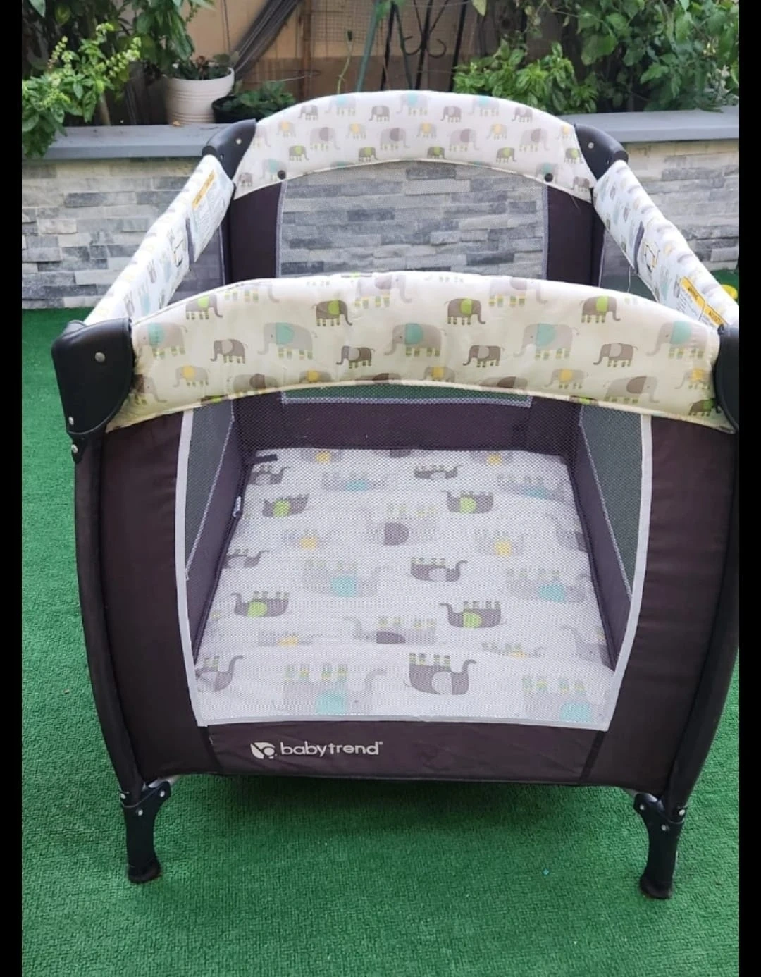 This is a Baby Trend playard with a cute elephant pattern. It features mesh sides for ventilation. It's great for keeping your little one safe and entertained.
