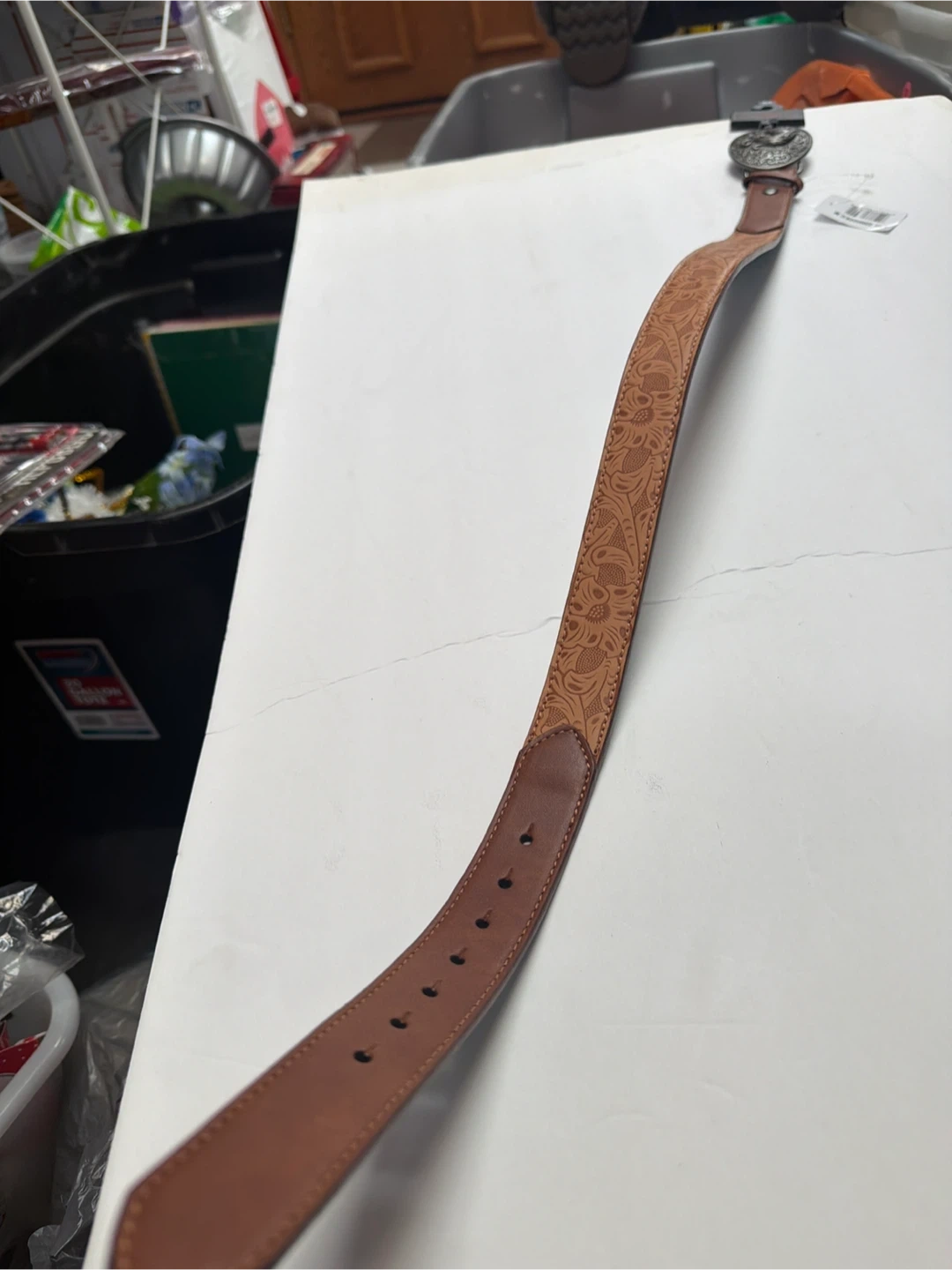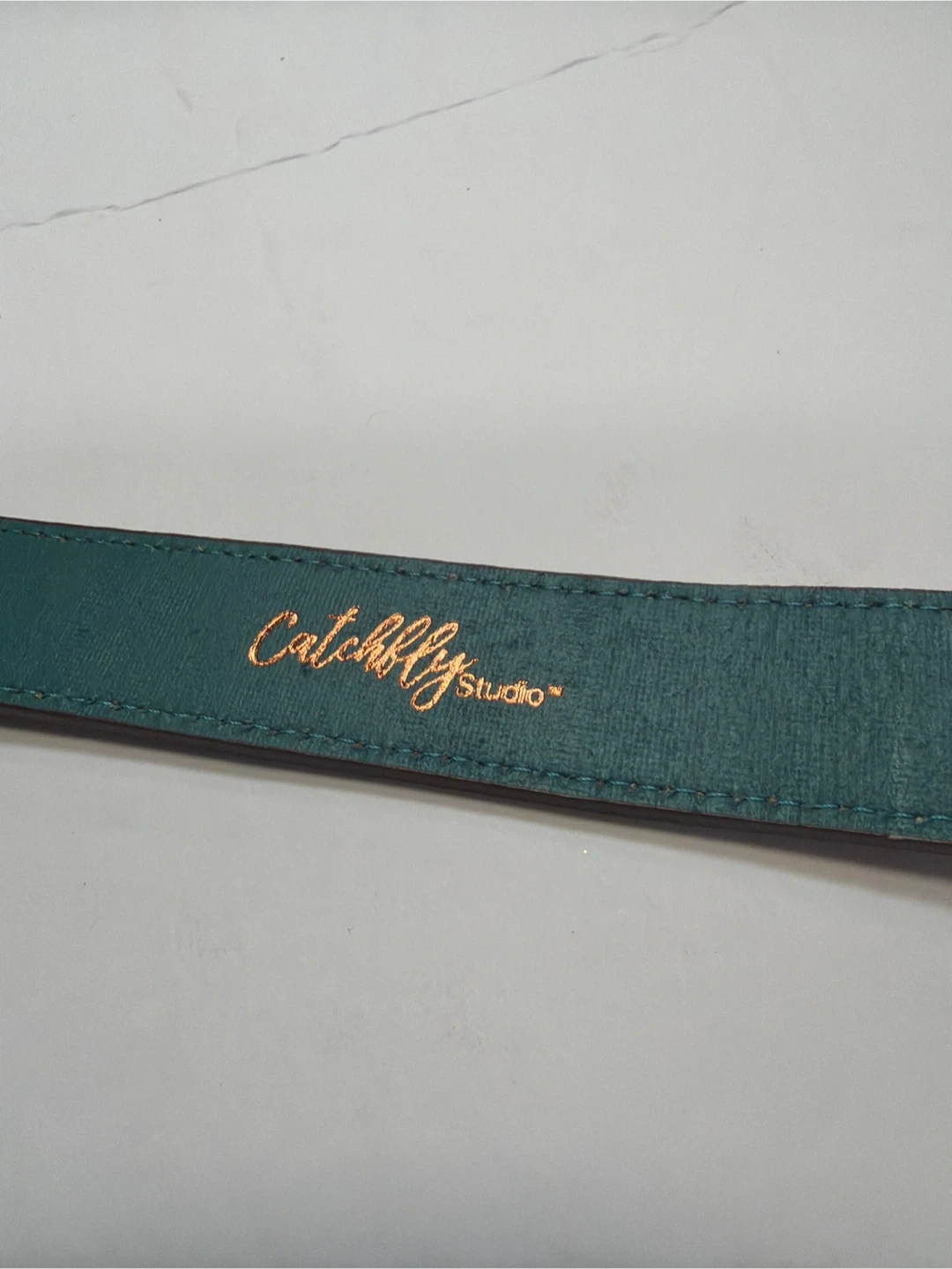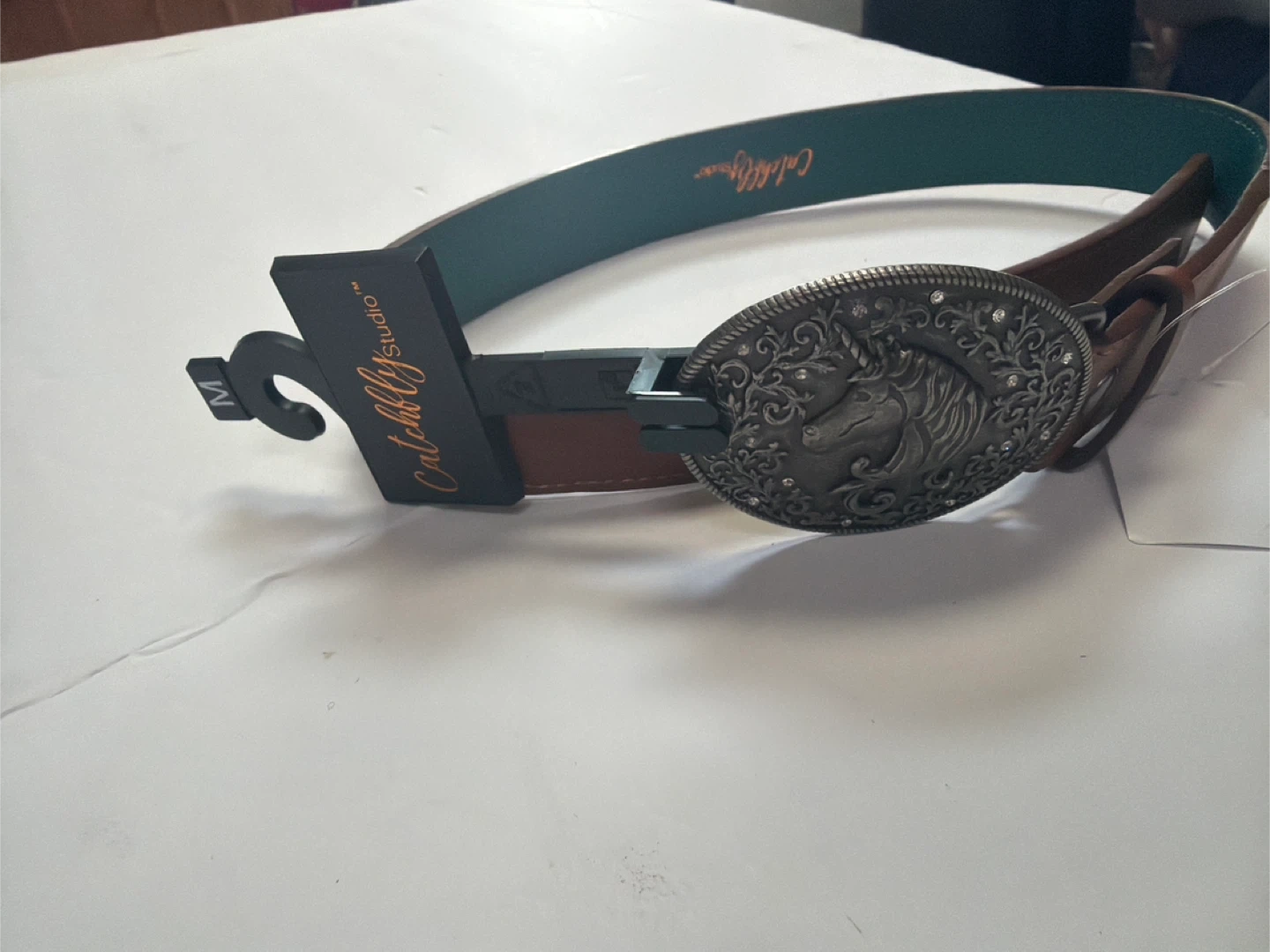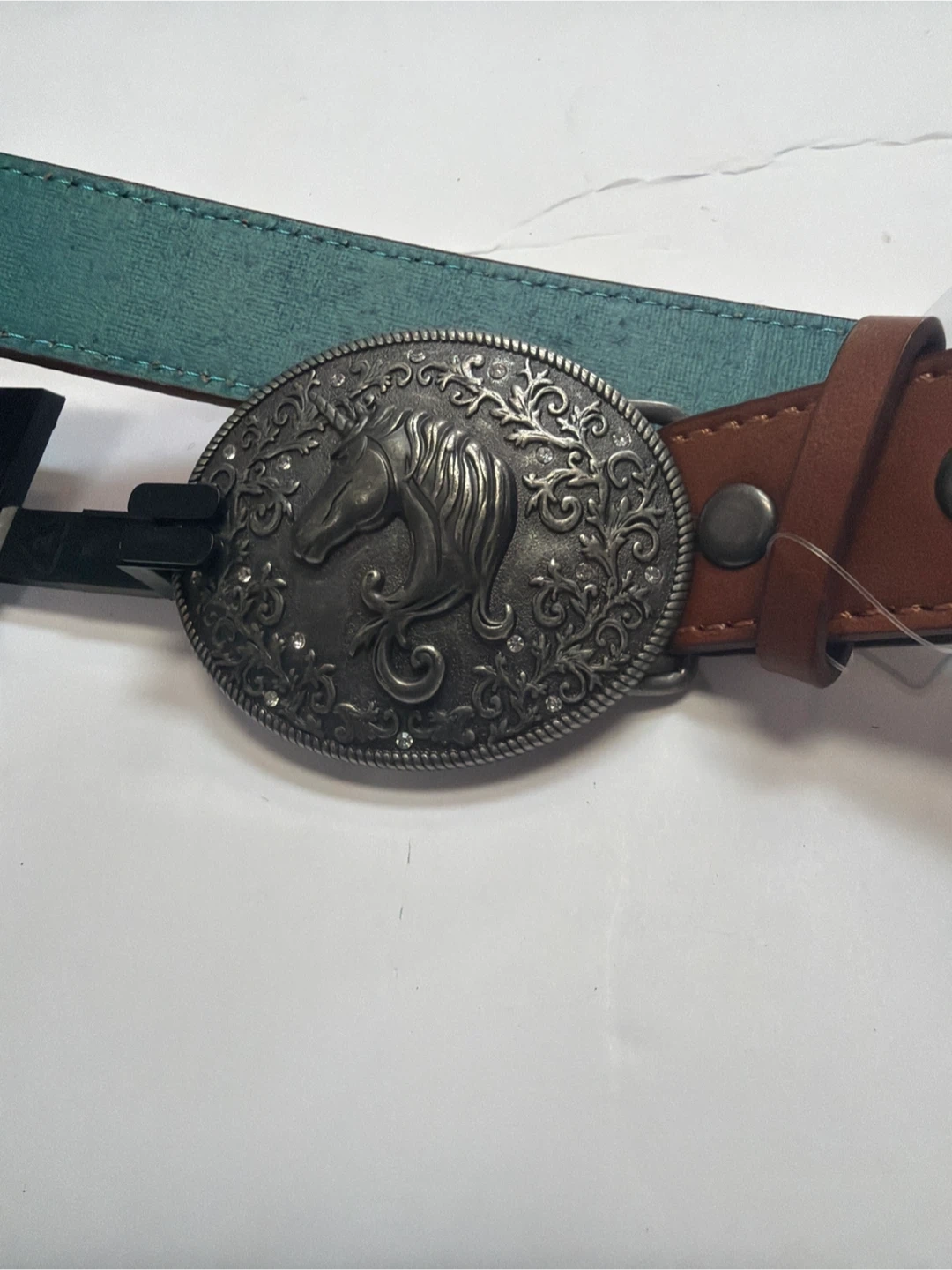 This Catchfly Studio belt features a decorative unicorn buckle with rhinestones. It's a size medium with embossed floral details on the brown leather. The belt has a teal green interior lining.