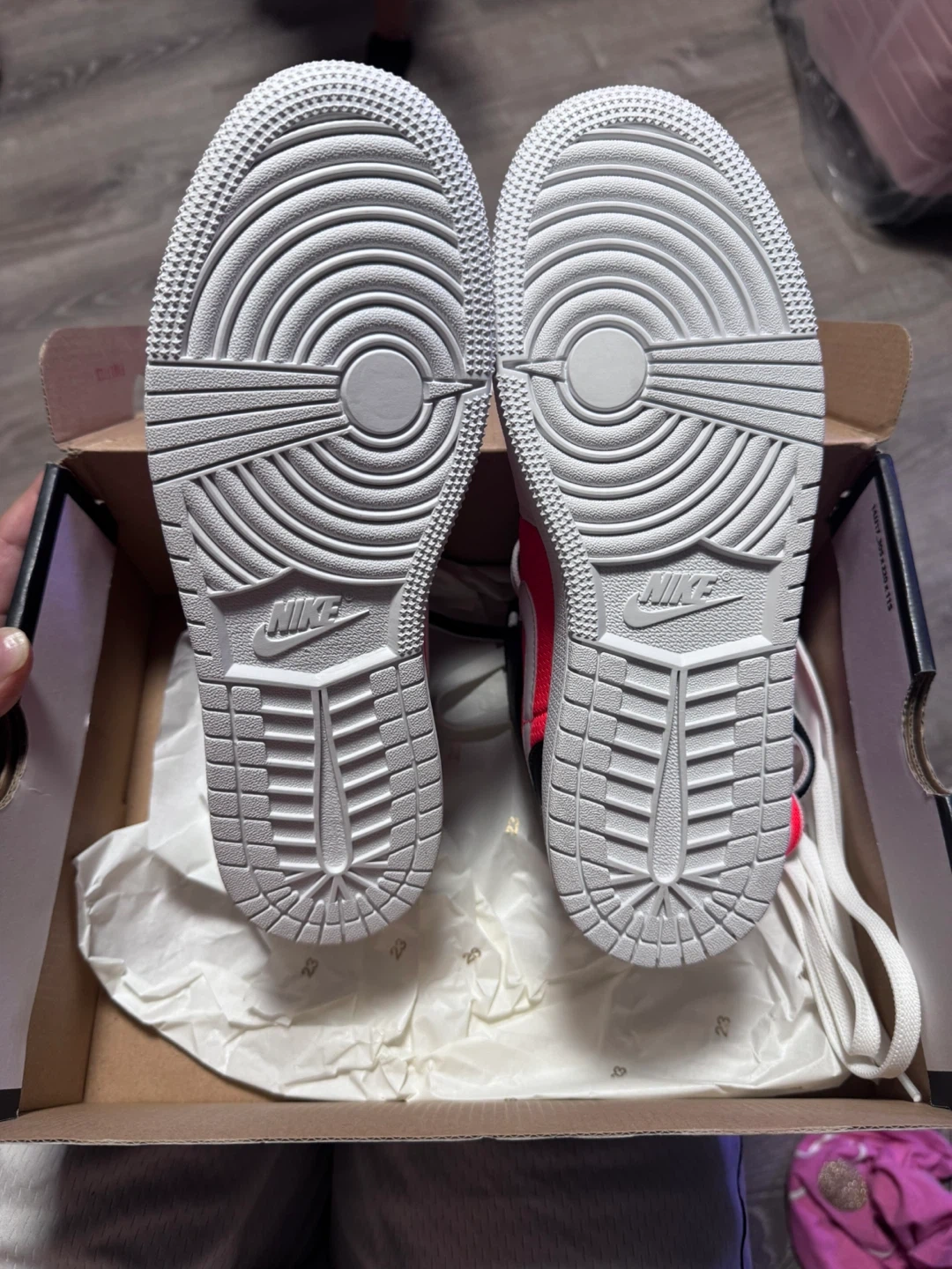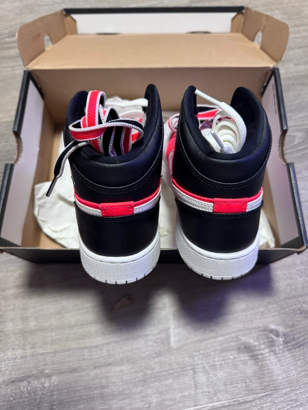 Selling a pair of Air Jordan 1 Mid Coral Chalk sneakers in size 7 Y! They come with the original box. Has a slight defect on the white of one of the shoes. Never worn. Comes with extra laces.