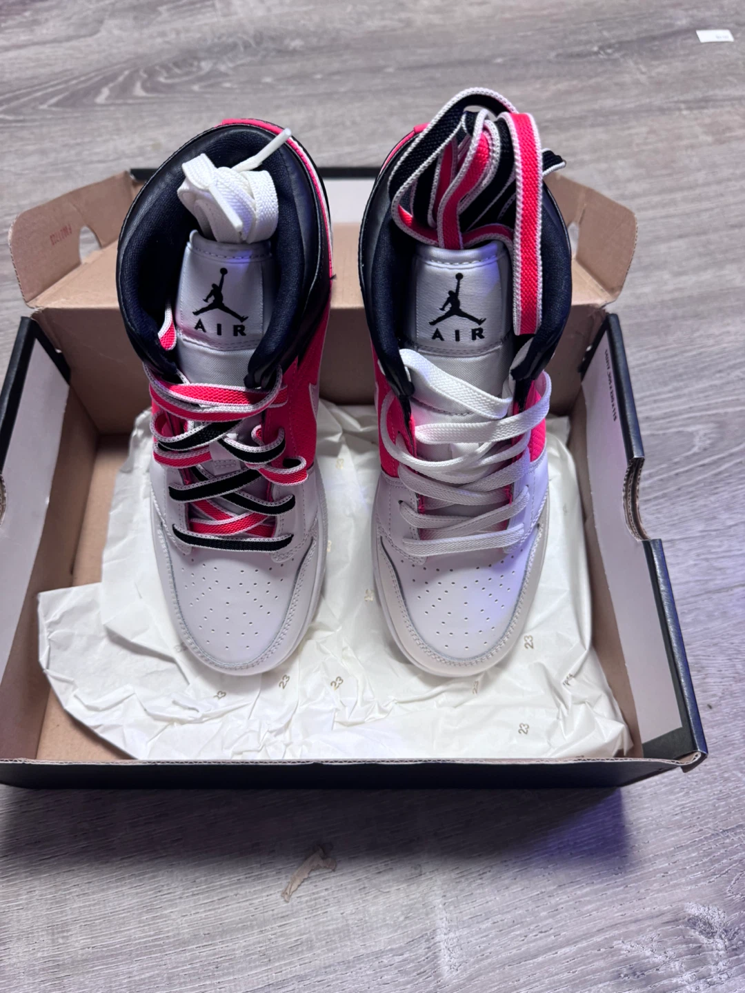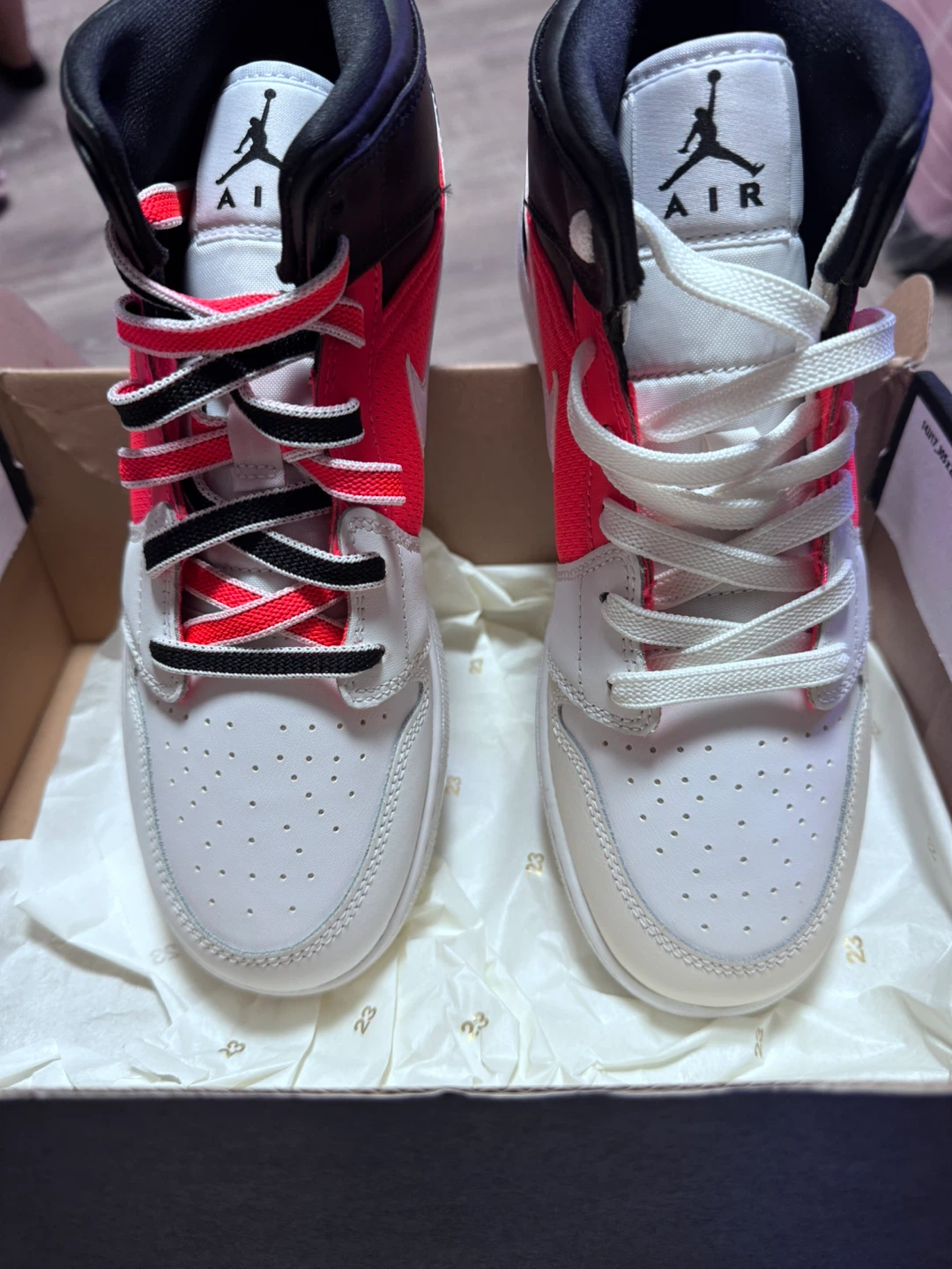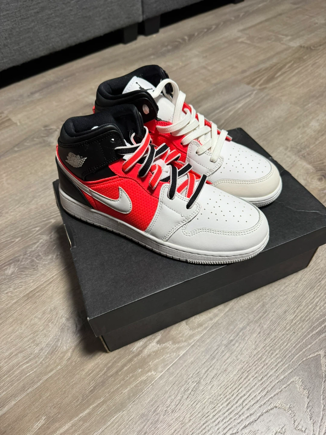 Selling a pair of Air Jordan 1 Mid Coral Chalk sneakers in size 7 Y! They come with the original box. Has a slight defect on the white of one of the shoes. Never worn. Comes with extra laces.