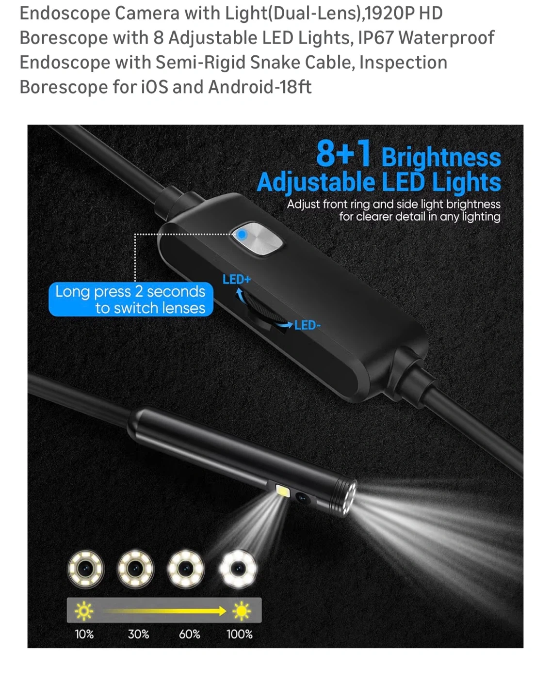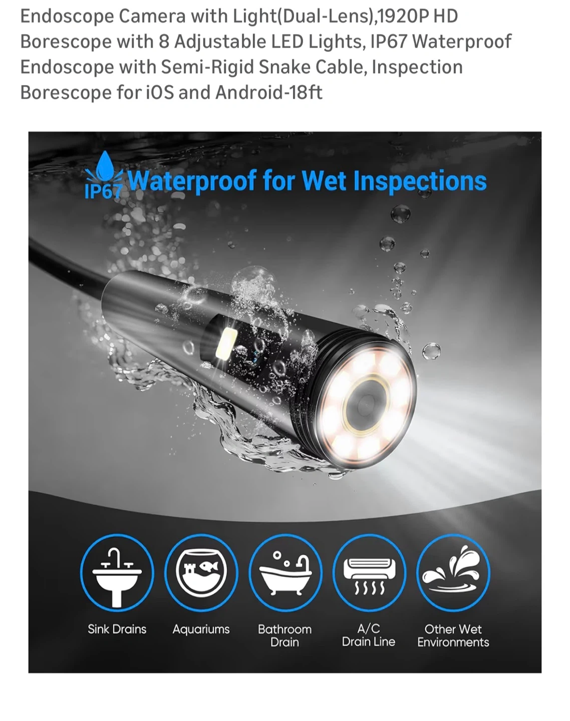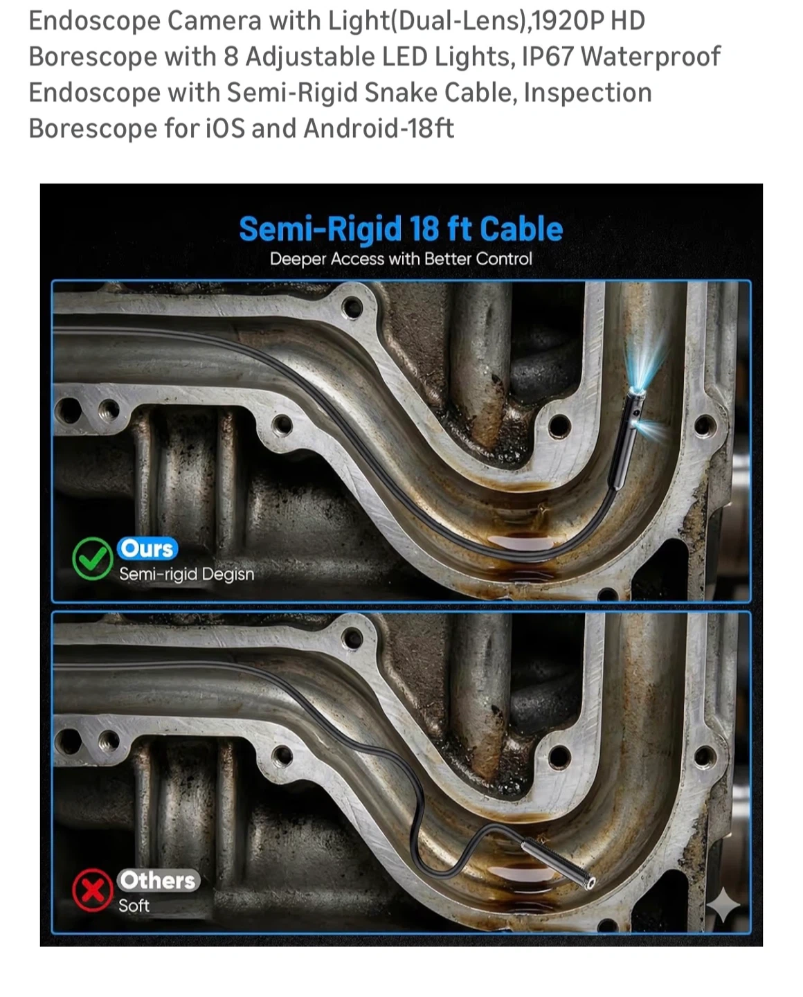 Endoscope Camera with Light(Dual-Lens),1920P HD Borescope with 8 Adjustable LED Lights, IP67 Waterproof Endoscope with Semi-Rigid Snake Cable, Inspection Borescope for iOS and Android-18ft