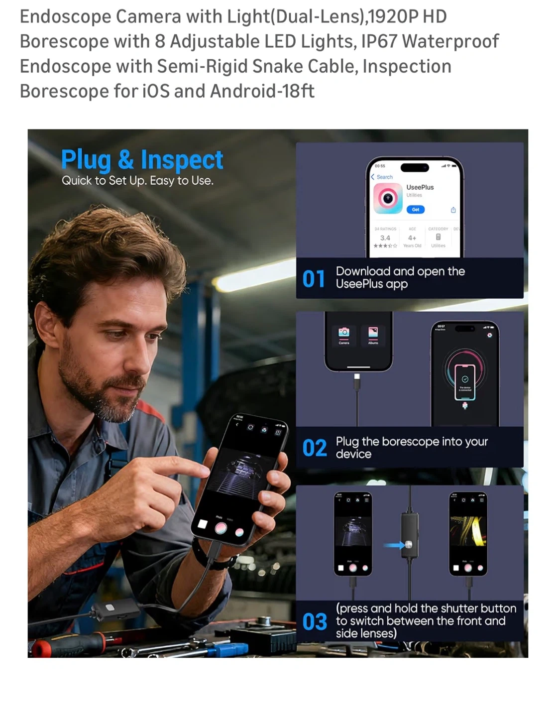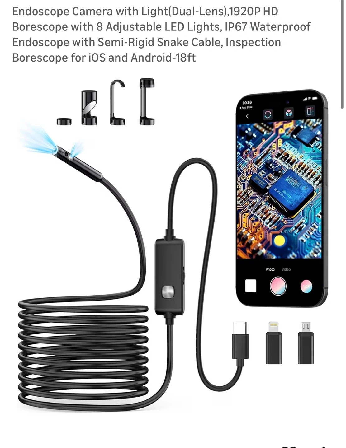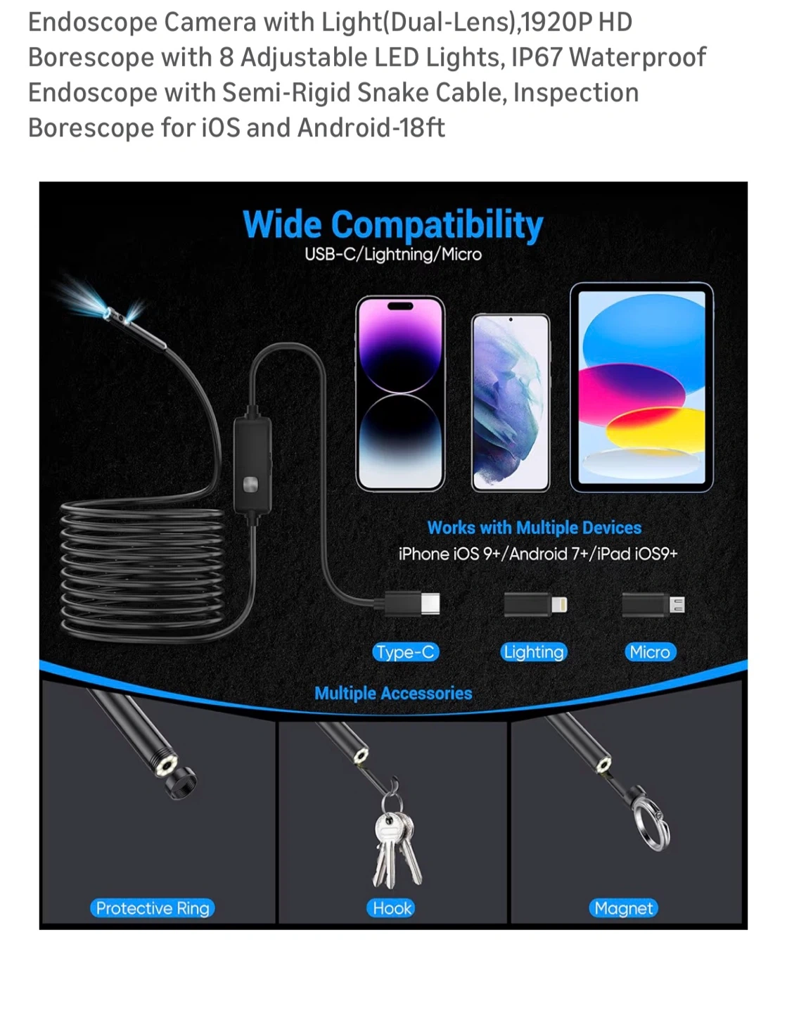 Endoscope Camera with Light(Dual-Lens),1920P HD Borescope with 8 Adjustable LED Lights, IP67 Waterproof Endoscope with Semi-Rigid Snake Cable, Inspection Borescope for iOS and Android-18ft