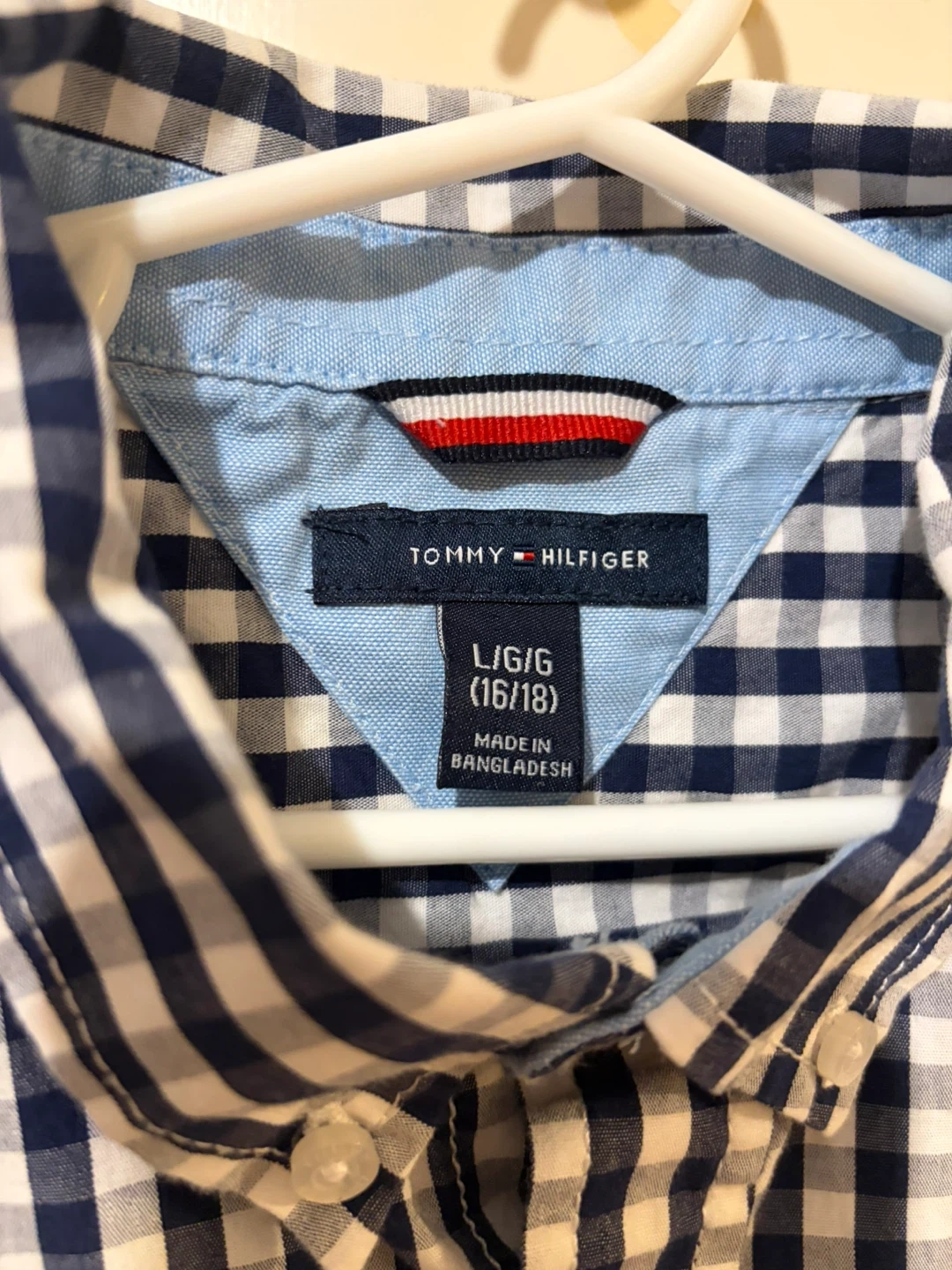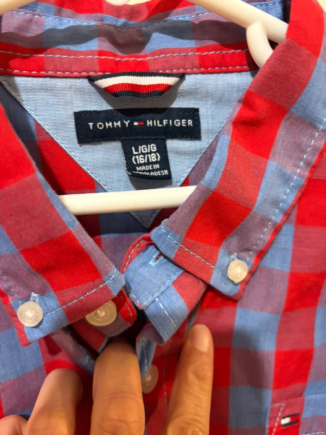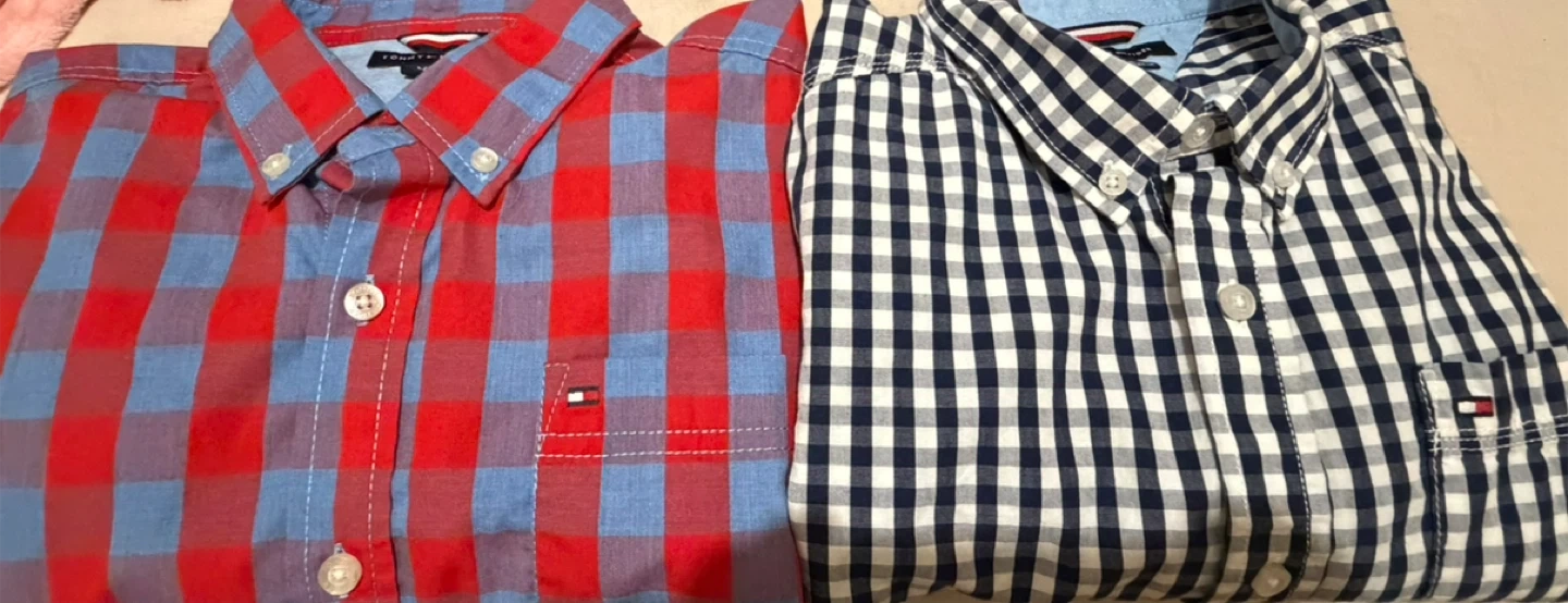 2 Tommy Hilfiger boys' button-down long sleeve shirts. Like new . My son outgrew it way too fast . Size L (16/18). Made in Bangladesh.