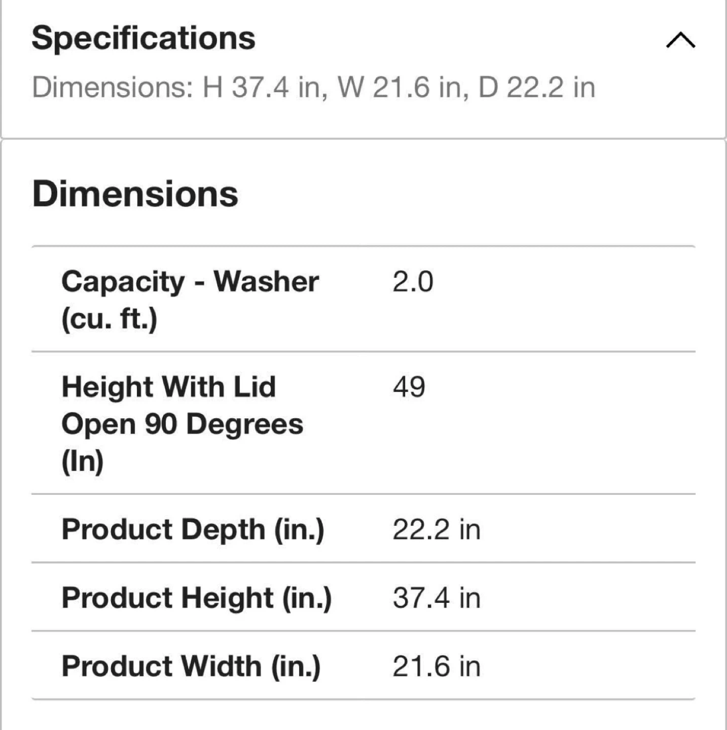 This is a BLACK+DECKER 2.0 cu. ft. portable washer. Its dimensions are 37.4" height, 21.6" width, and 22.2" depth. It's a top-load washing machine.