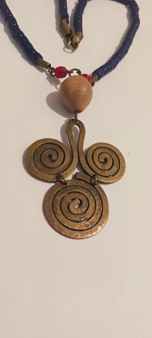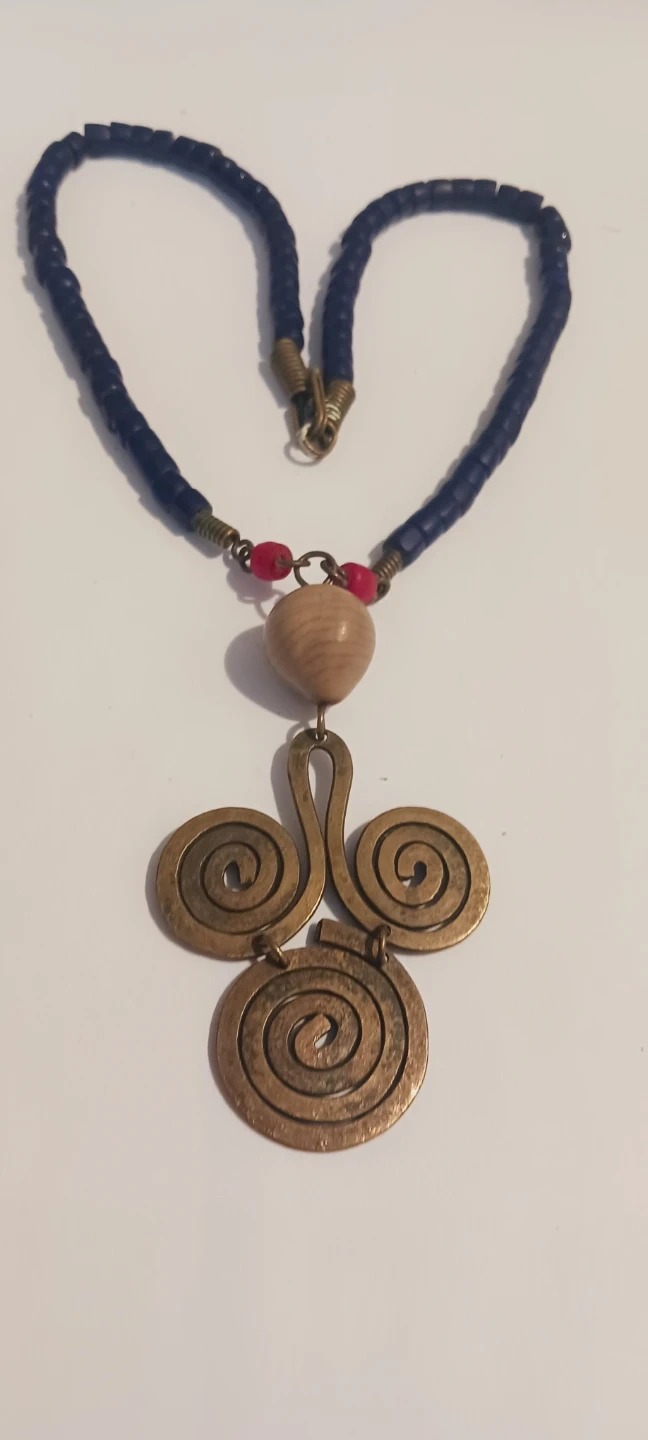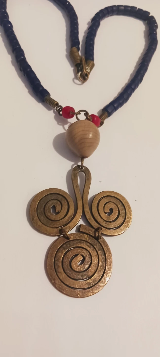 Buddhist Himachal Sacred Spiral Pendant with 2 small Coral beads blue beaded necklace. This necklace features a strand of small, dark blue beads and a striking pendant. The pendant has a central wooden bead and a large, ornate metal piece with a matte bronze finish, designed with three interconnected spirals. It's finished with small Coral beads accents and a clasp closure. The length of a necklace 14" long. The size of a pendant 3"×2". Excellent vintage condition. ALL MY PRICES ARE NEGOTIABLE !!