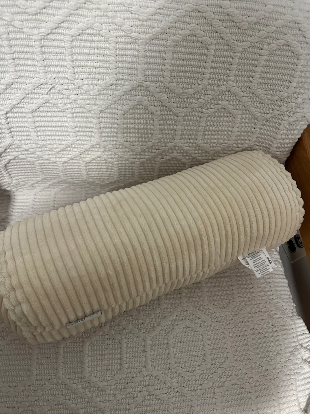 This cream-colored bolster pillow has a soft corduroy texture. It's made of polyester. Great for extra support or as a decorative accent! Bough at 15