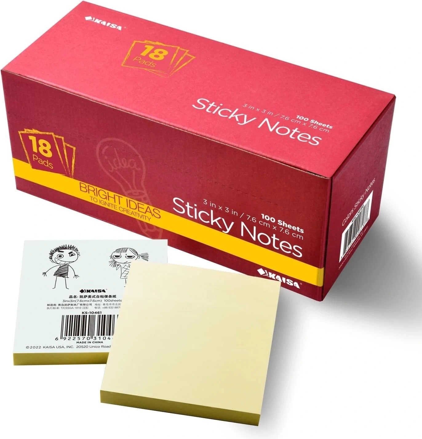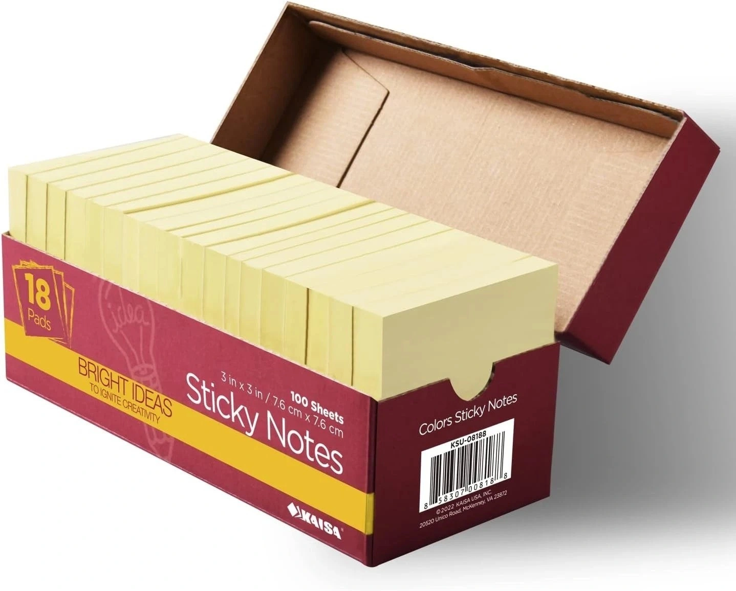 10Brand new sticky note packs – each box includes 18 yellow sticky note pads, 3x3 inch, 100 sheets each (1,800 notes total). Perfect for office, school, home use, or resellers. I have 12 boxes available – selling individually or in bundles. • $10 each • 2 for $18 • 3 for $25 • All 12 for $90 (bulk deal) -BULK QUANTITY: Package includes 18 pads of sticky notes with 100 sheets per pad, providing 1,800 total notes for all your organizational needs -PERFECT SIZE: Each note measures 3 x 3 inches (7.6 x 7.6 cm), offering ample writing space while remaining compact and convenient to use -RELIABLE ADHESIVE: Strong adhesive backing allows notes to stick securely to most surfaces while being easily removable without leaving residue -VIBRANT COLOR: Canary yellow color provides excellent visibility and readability for important reminders and messages -VERSATILE USE: Ideal for office organization, home reminders, bookmarking, note-taking, and leaving messages in any setting