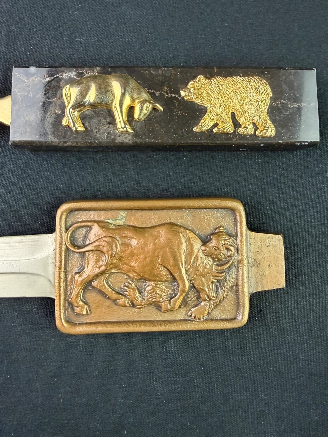 Set of two vintage letter openers. One features a bull and bear design on a black handle. The other has 'BULL - BEAR' engraved on the blade and a bull design on the copper-toned handle. Both are crafted by Hirsch & Cie, S.A., Geneva. These make a great addition to a desk!
