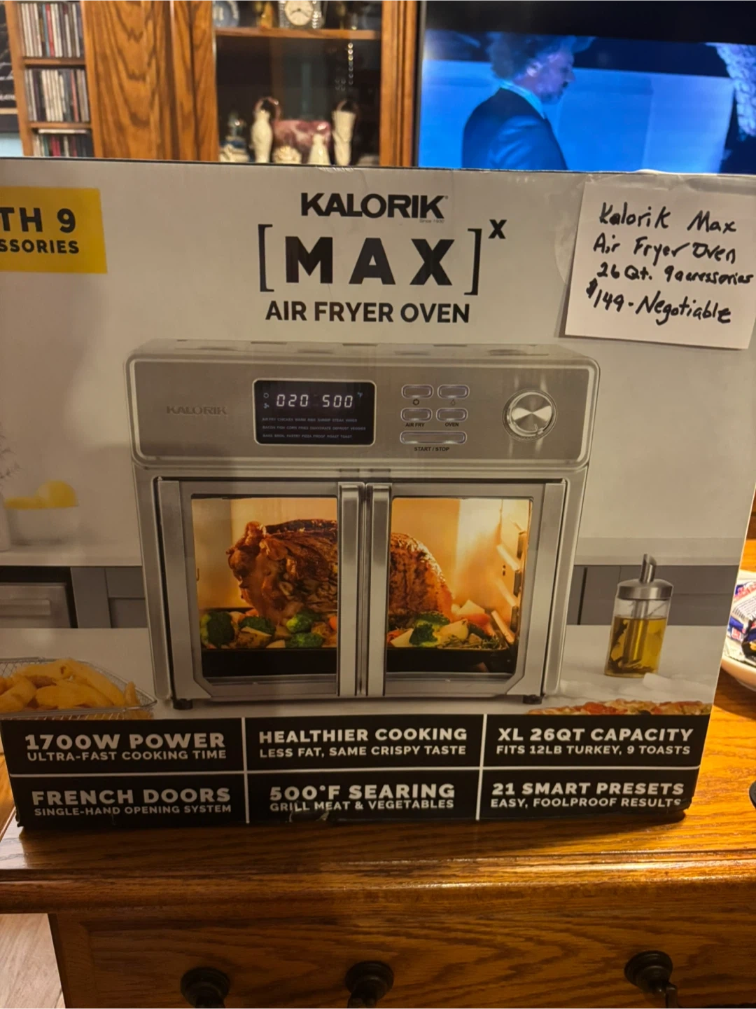 Selling a Kalorik MAX Air Fryer Oven with a spacious XL 26Qt capacity! This versatile appliance offers healthier cooking with less fat and crispy results. It features 1700W power, French doors for easy access, and reaches up to 500°F for searing. With 21 smart presets, you can achieve easy, foolproof results every time. It even comes with 9 accessories to do it all