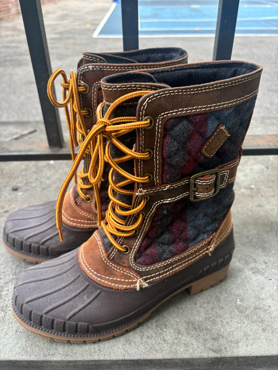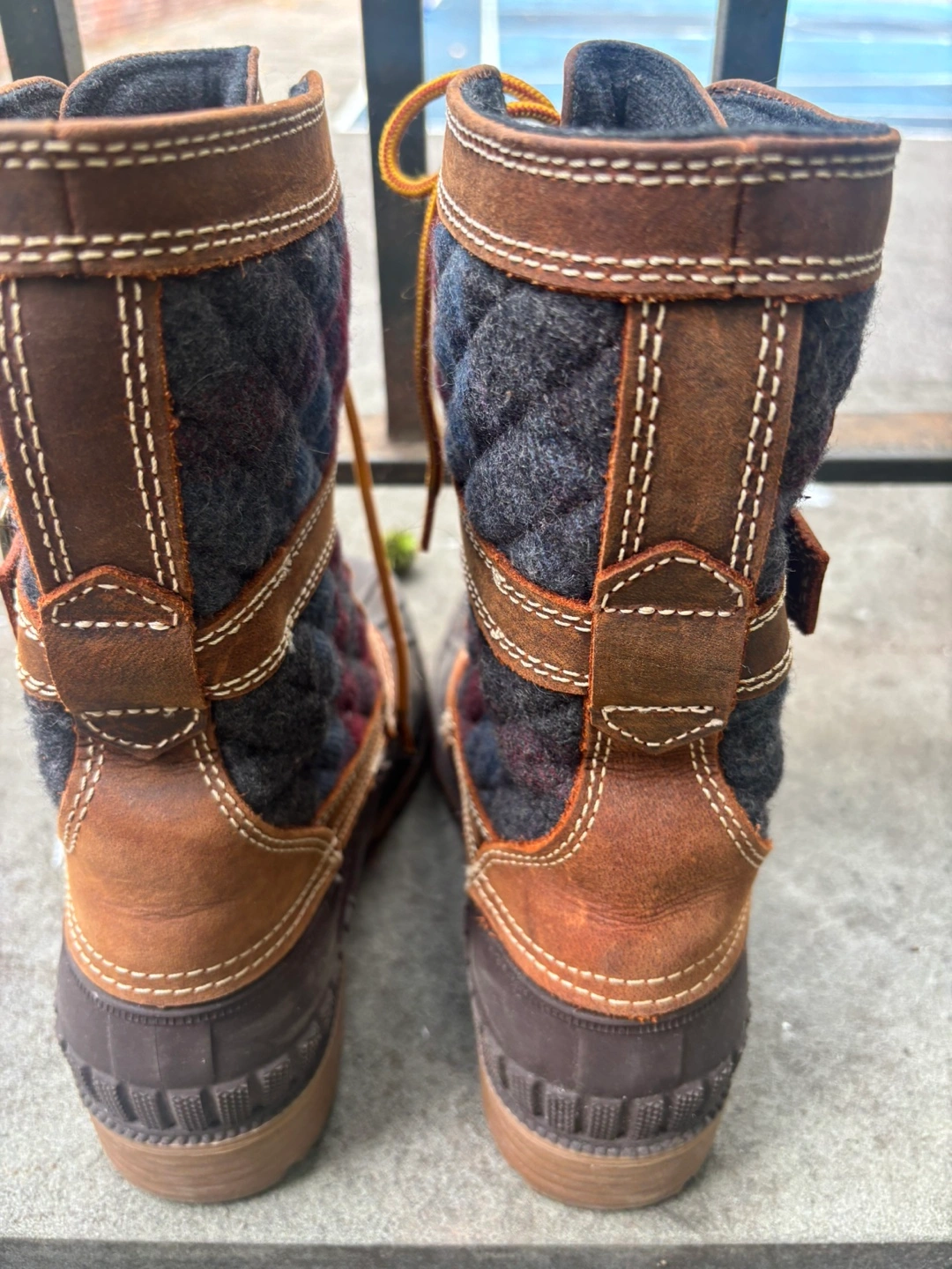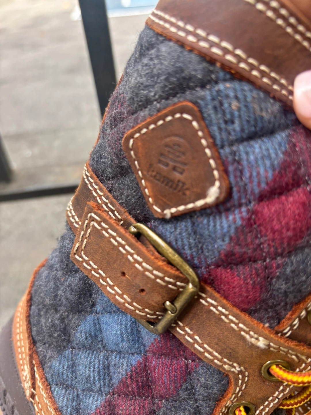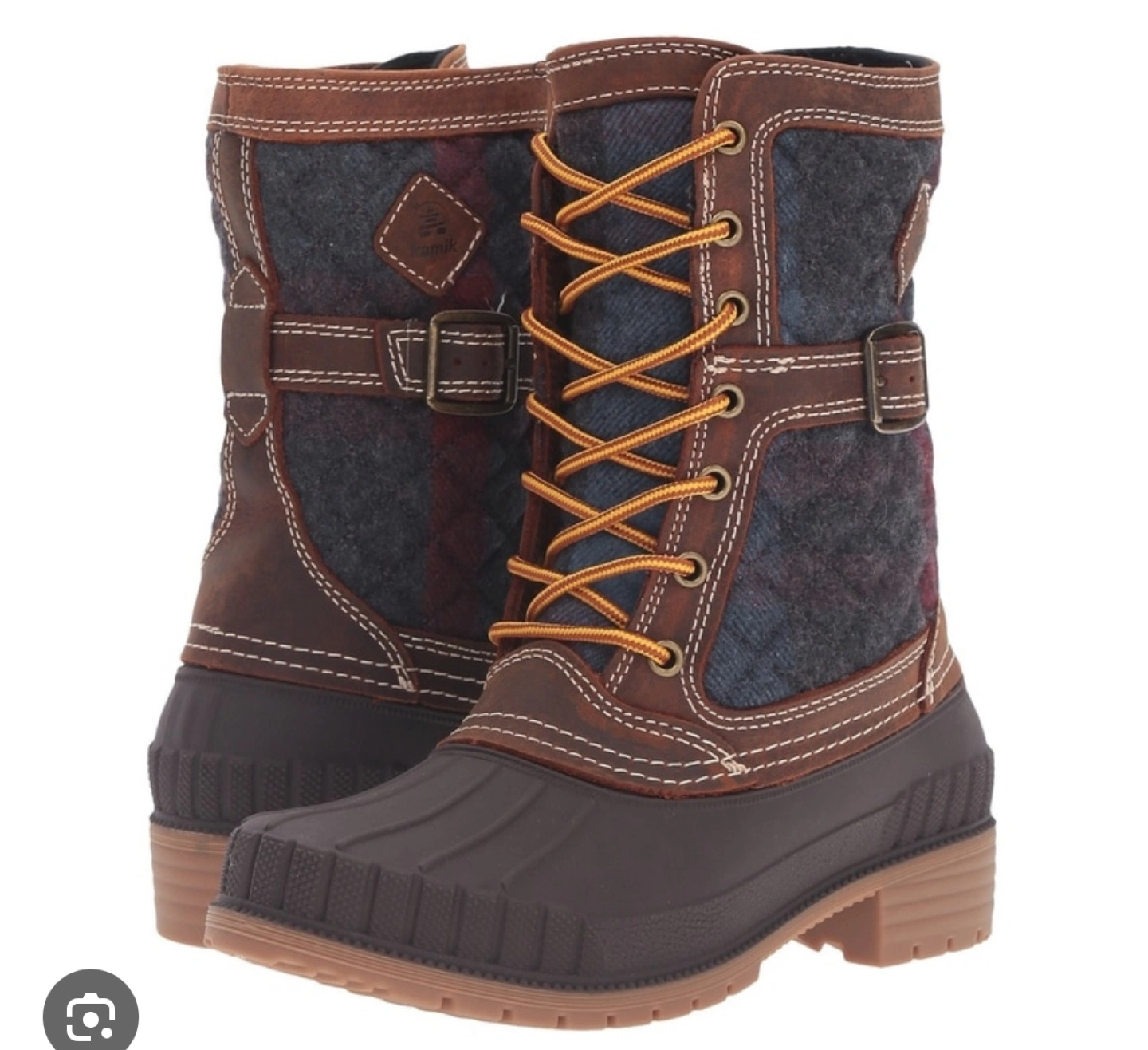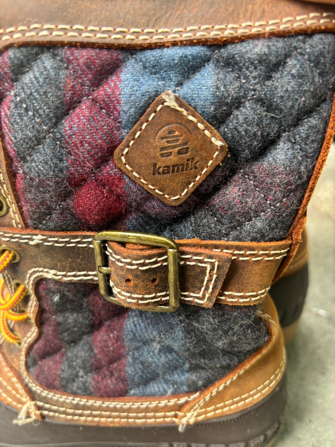These are a pair of Kamik winter boots with a plaid pattern on the upper part of the boot. They have brown leather accents and yellow laces. These boots are perfect for keeping your feet warm and dry during the winter months