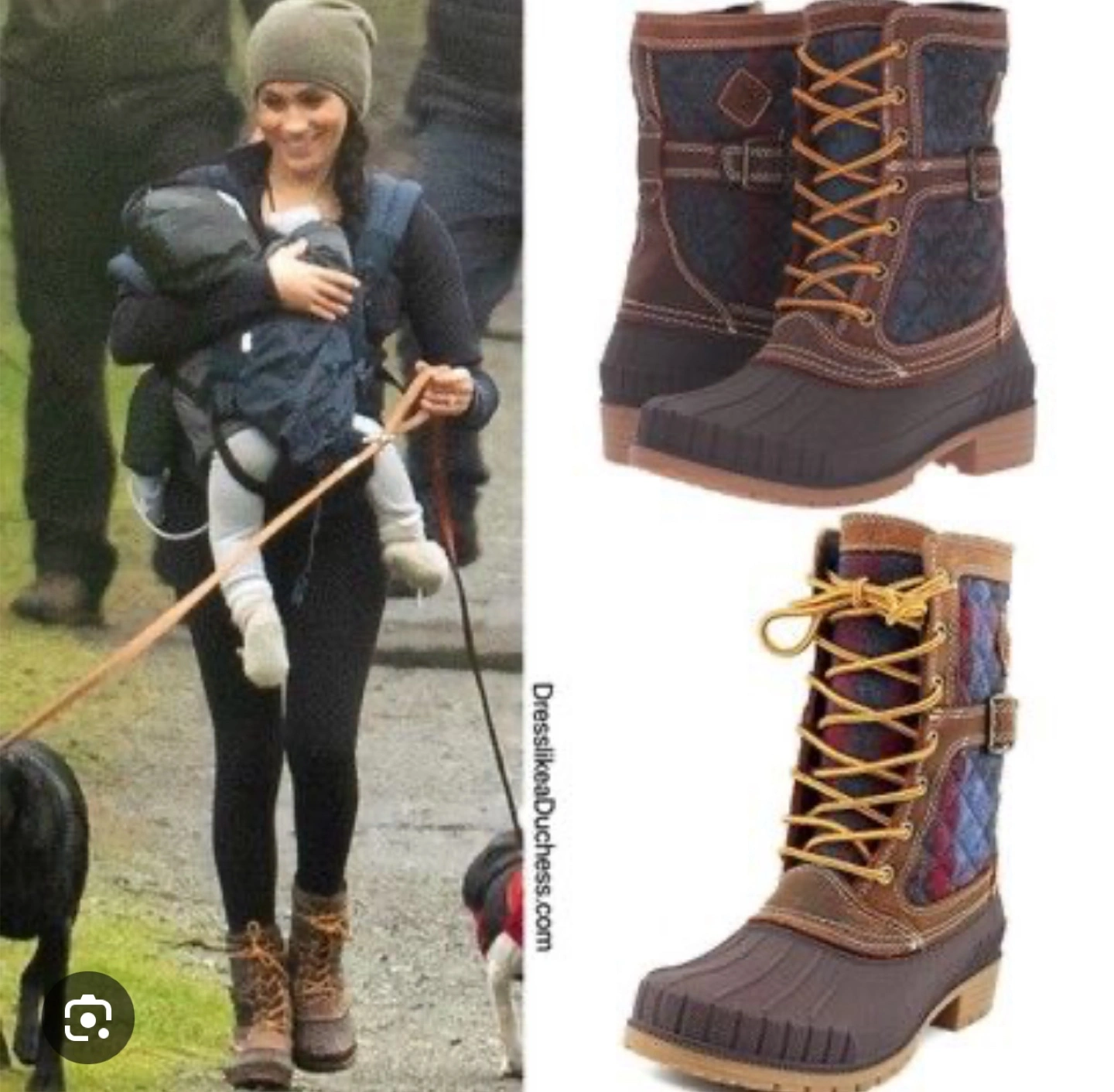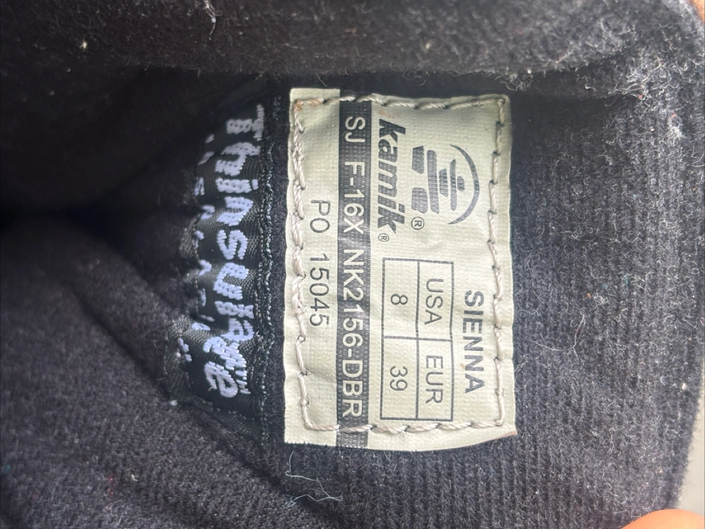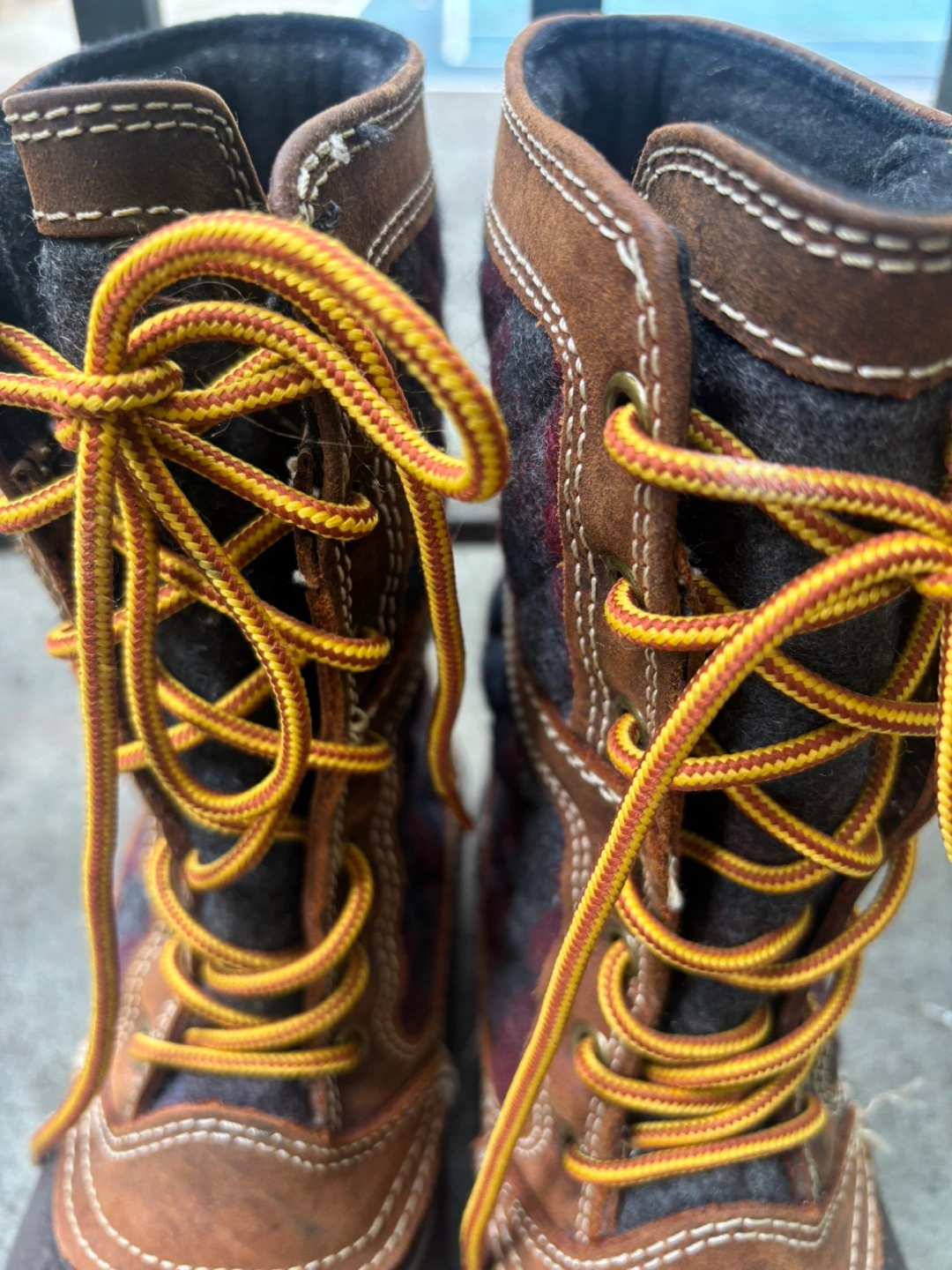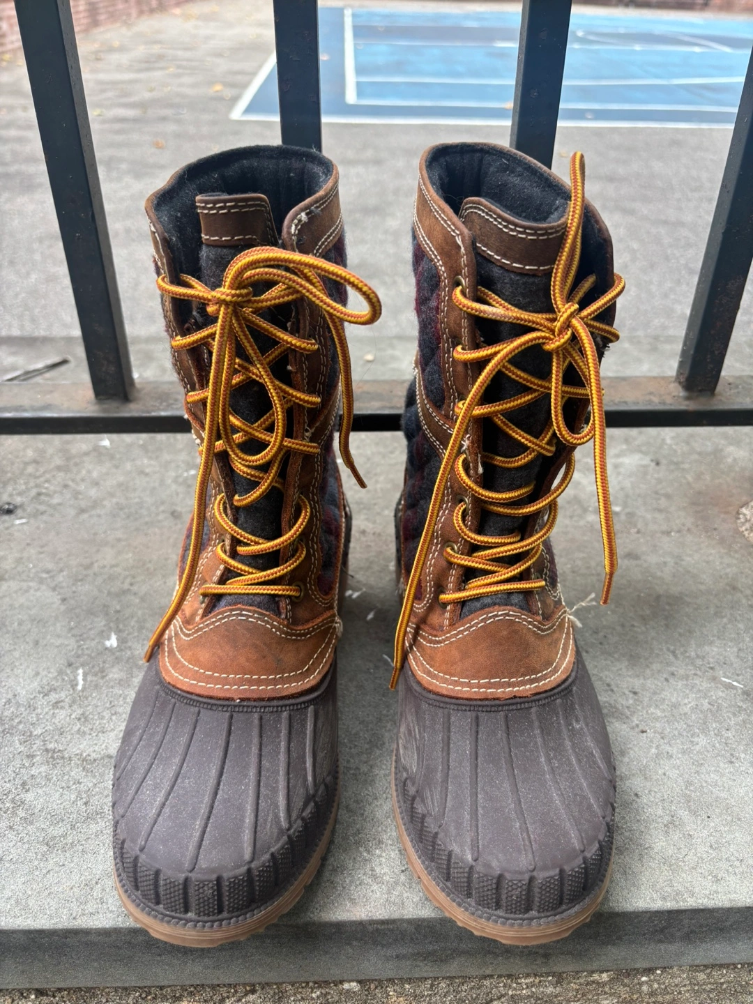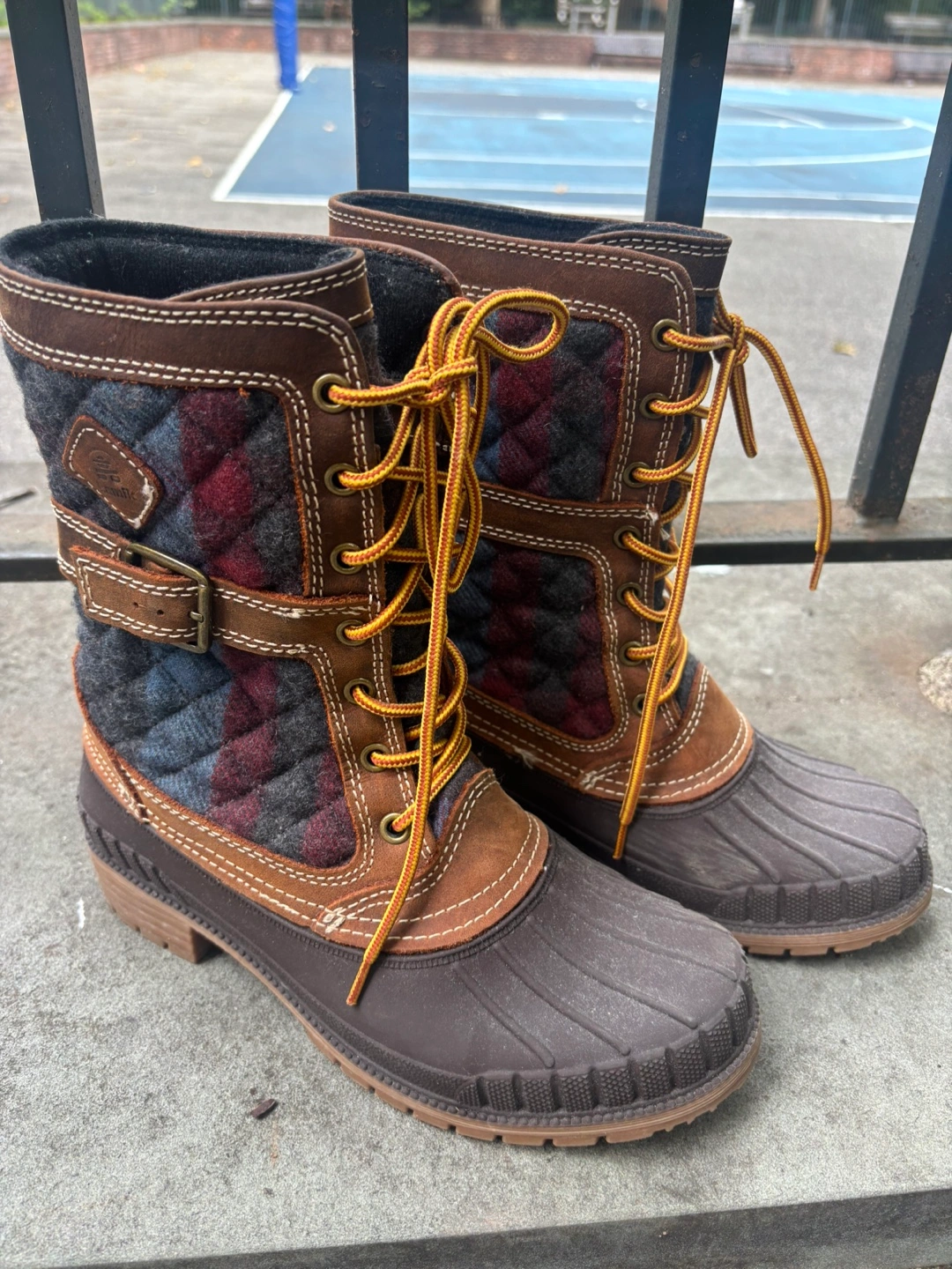 These are a pair of Kamik winter boots with a plaid pattern on the upper part of the boot. They have brown leather accents and yellow laces. These boots are perfect for keeping your feet warm and dry during the winter months