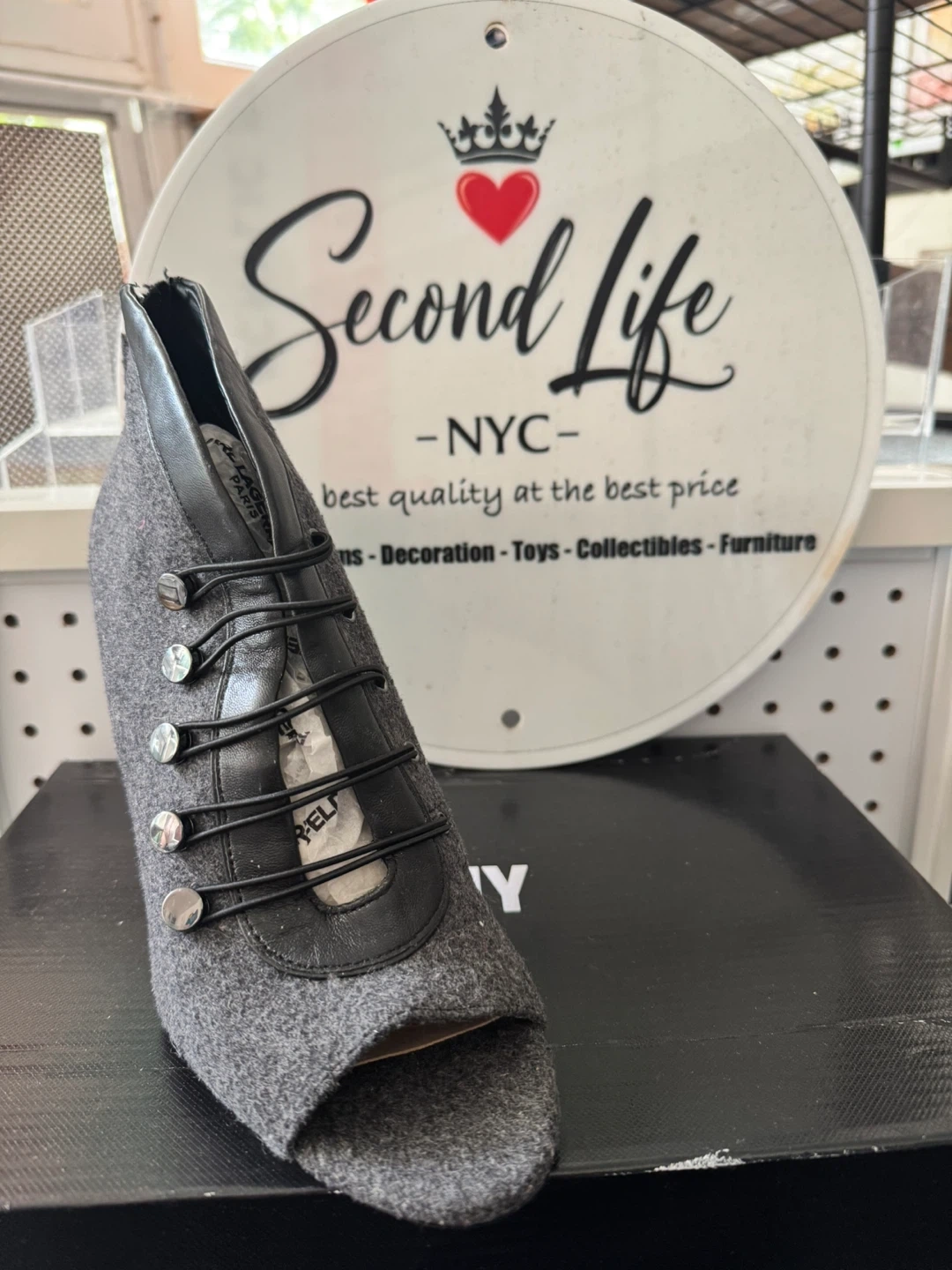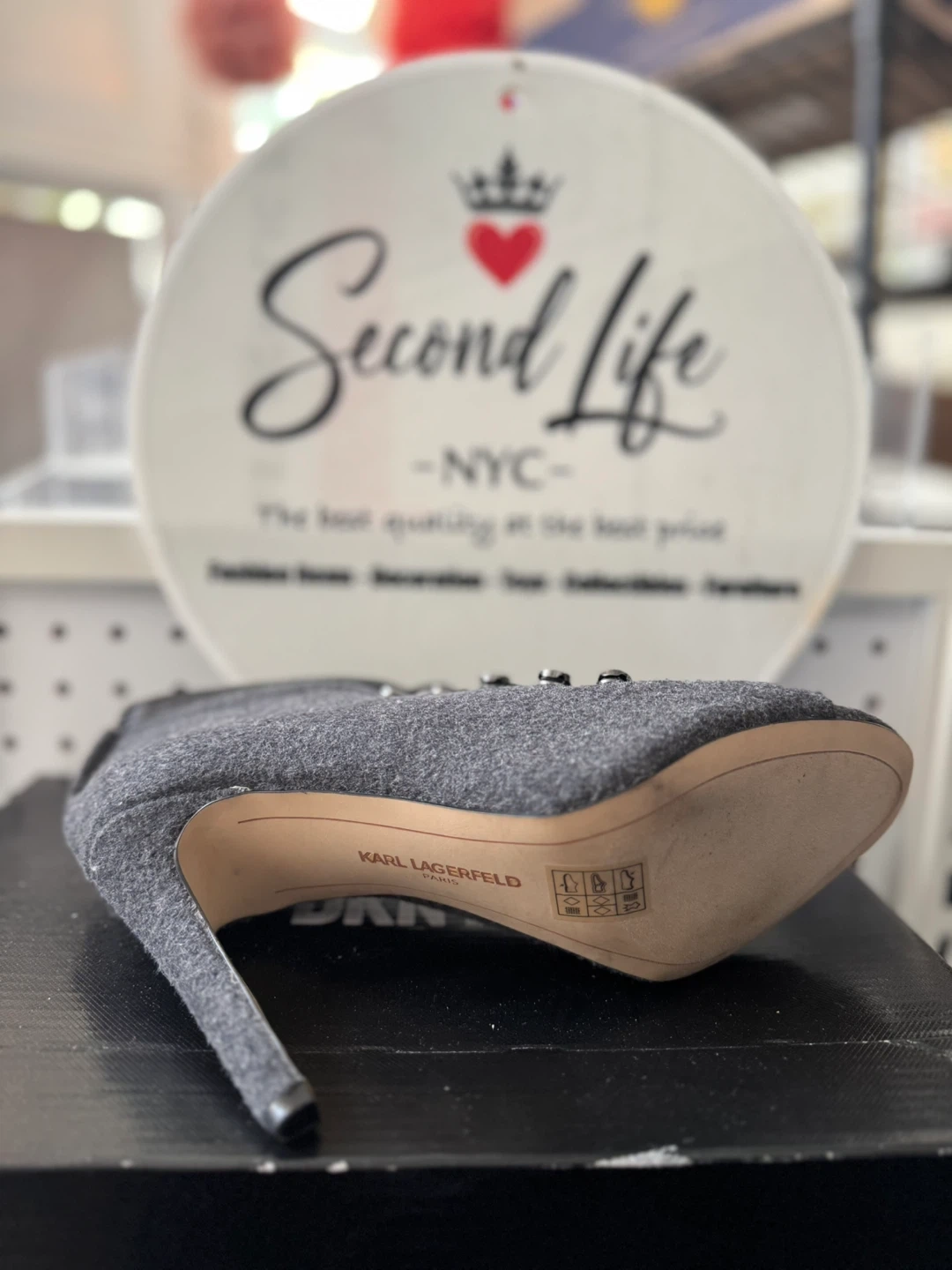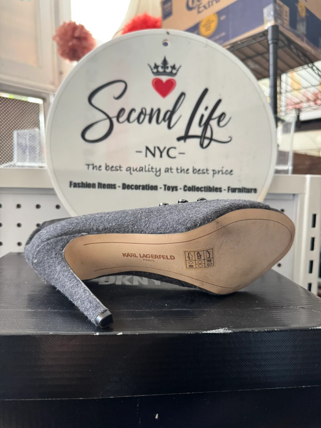 These are a pair of Karl Lagerfeld Paris heels in a gray color. They feature a unique design with button accents and a peep toe. The material appears to be a mix of textile and leather. The size is 7 / 37.5 visible in the images.