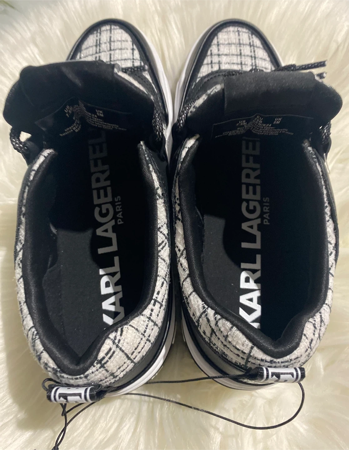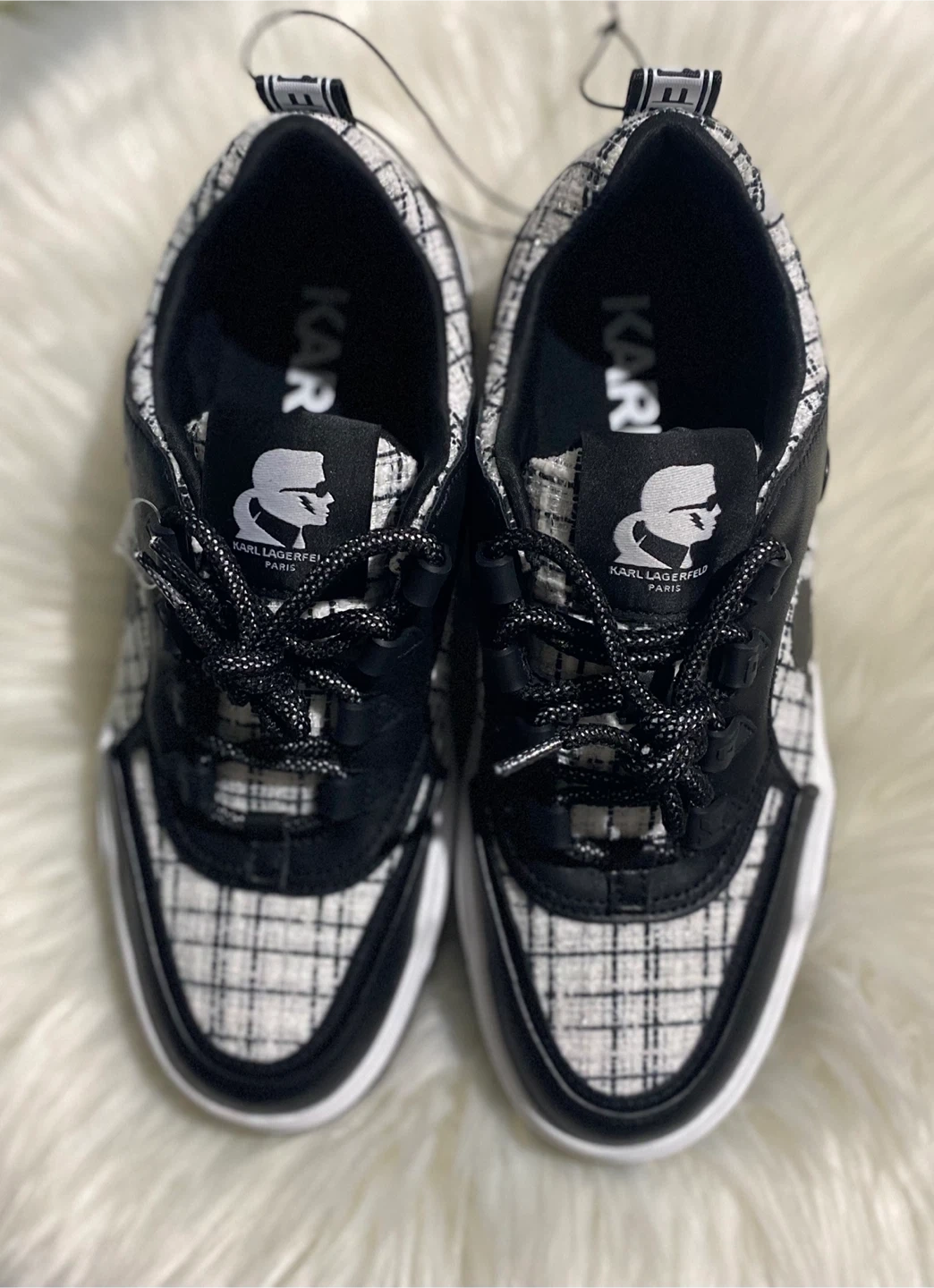 60Selling these stylish Karl Lagerfeld Paris sneakers! They feature a unique tweed design and have never been worn. Perfect for adding a touch of Parisian chic to your wardrobe. No box available.