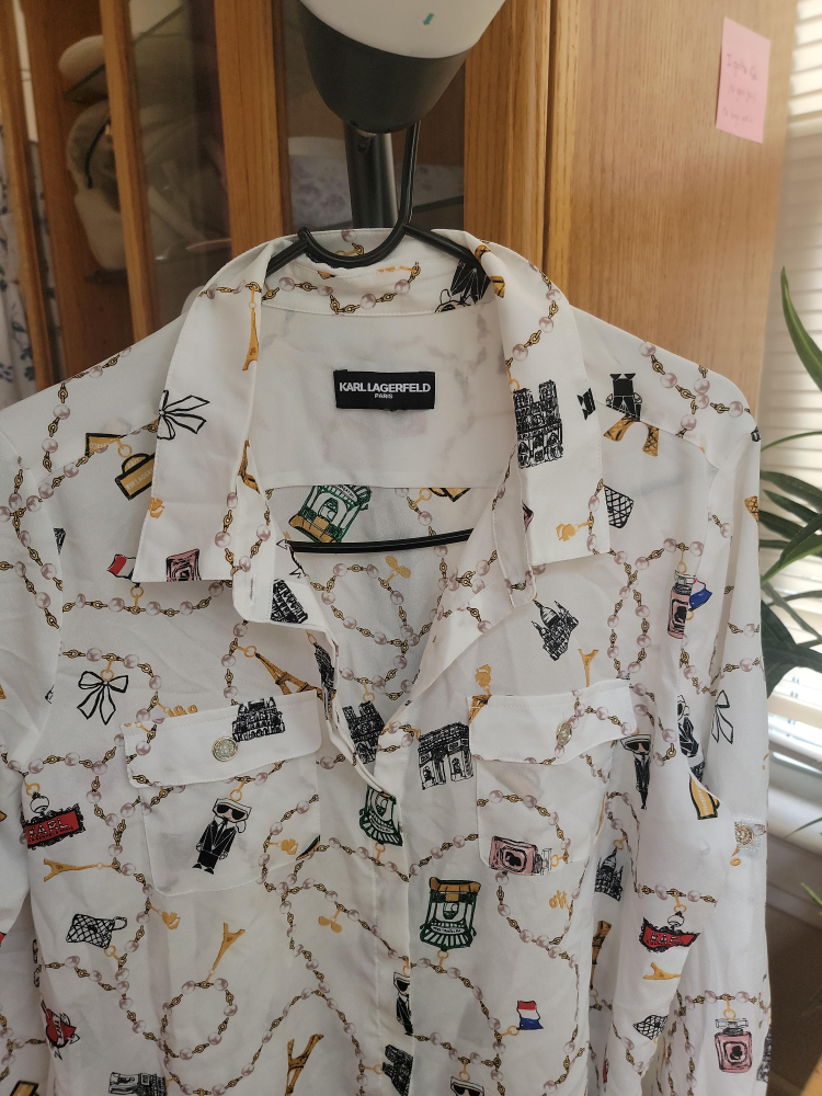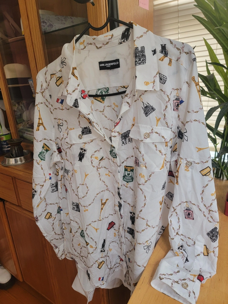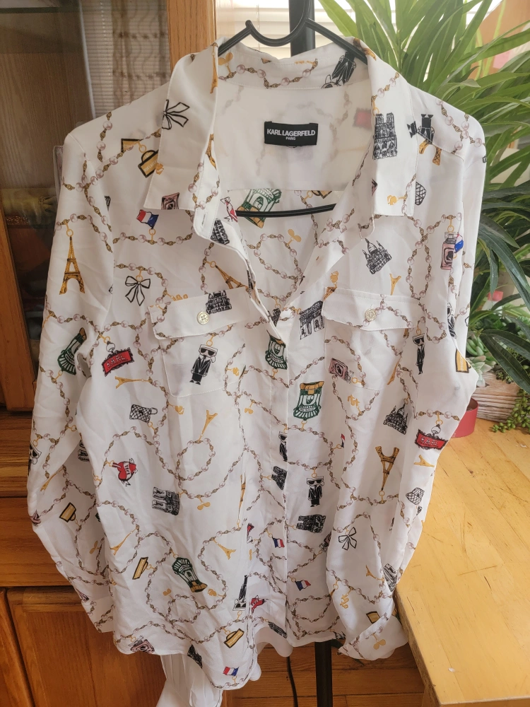 81Here's a cute Karl Lagerfeld Paris blouse! It features a fun pattern on a white background. Perfect for adding a bit of flair to your wardrobe