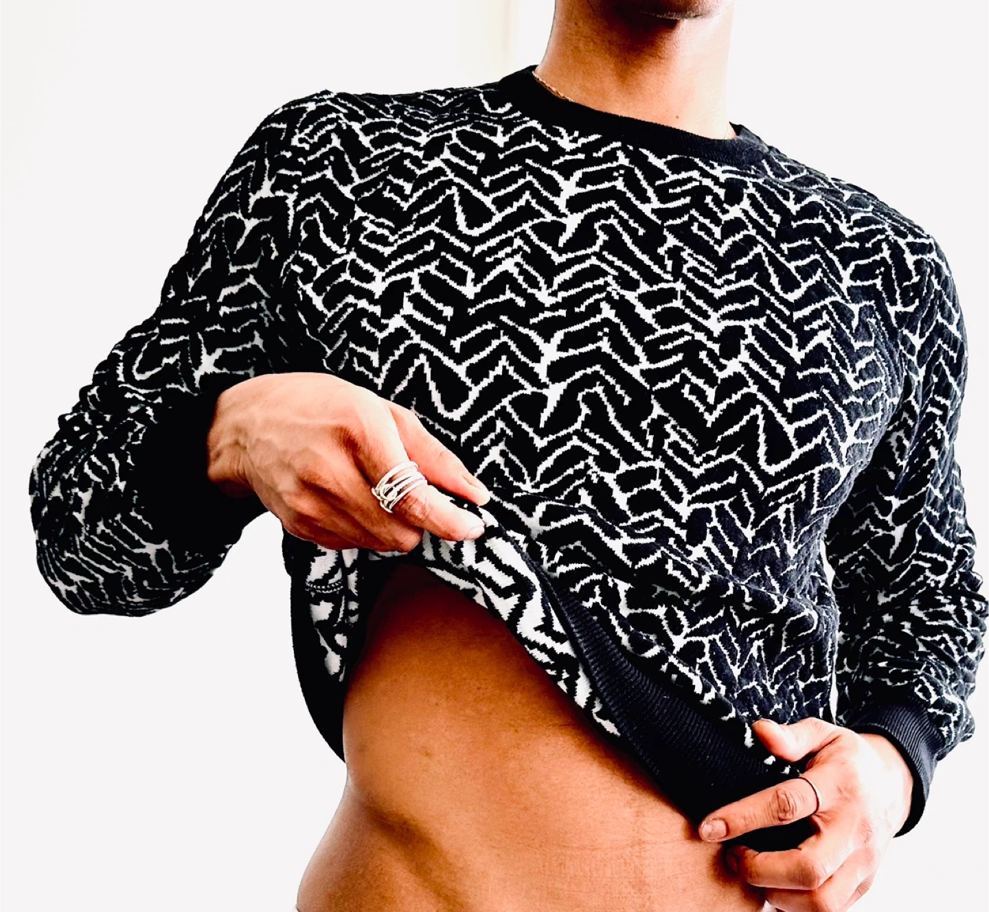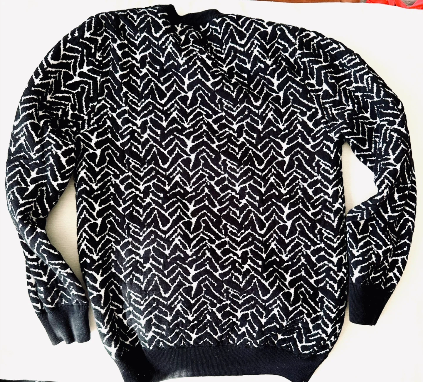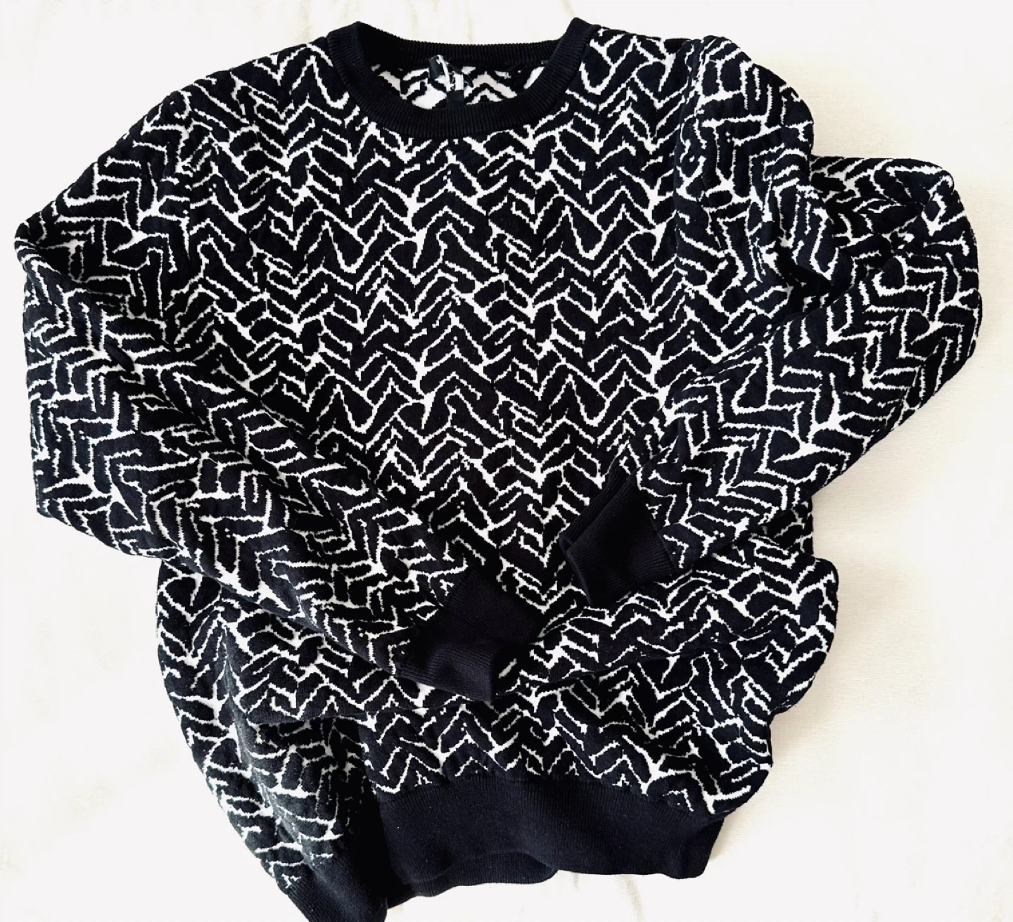 65A stylish black and white patterned sweater, perfect for adding a unique touch to your wardrobe! It's in great condition and ready for a new home