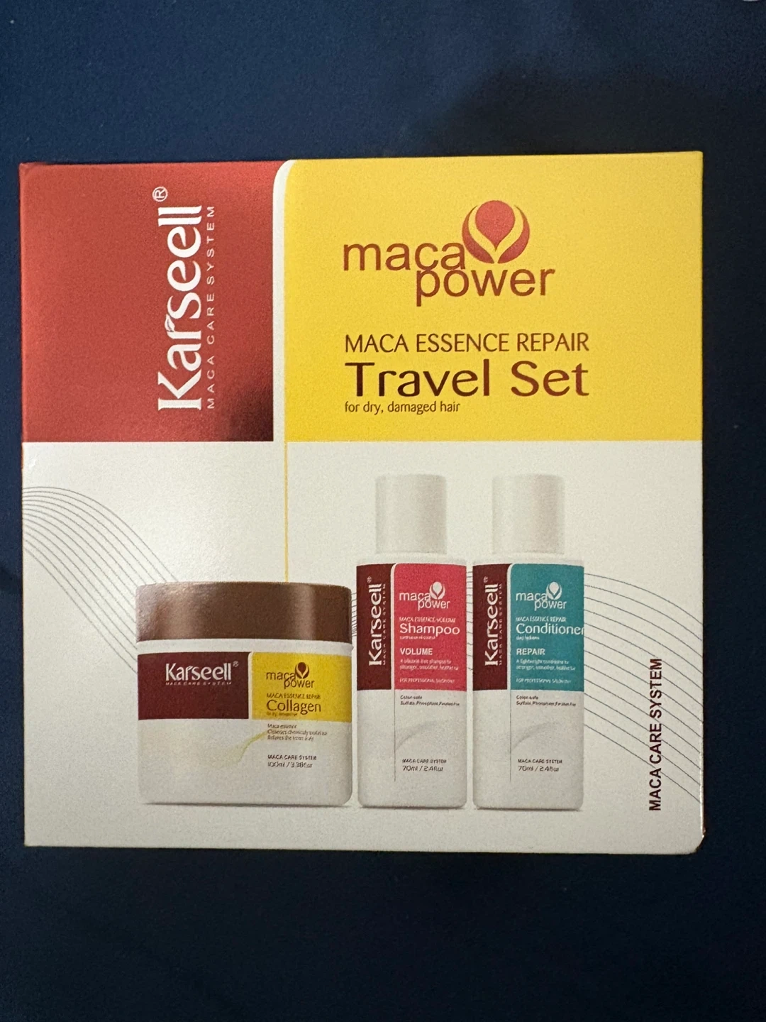 I'm selling a brand new Karseell Maca Power Travel Set for dry, damaged hair! This set is perfect for trying out the product or for taking on trips. It includes shampoo, conditioner, and a collagen hair mask