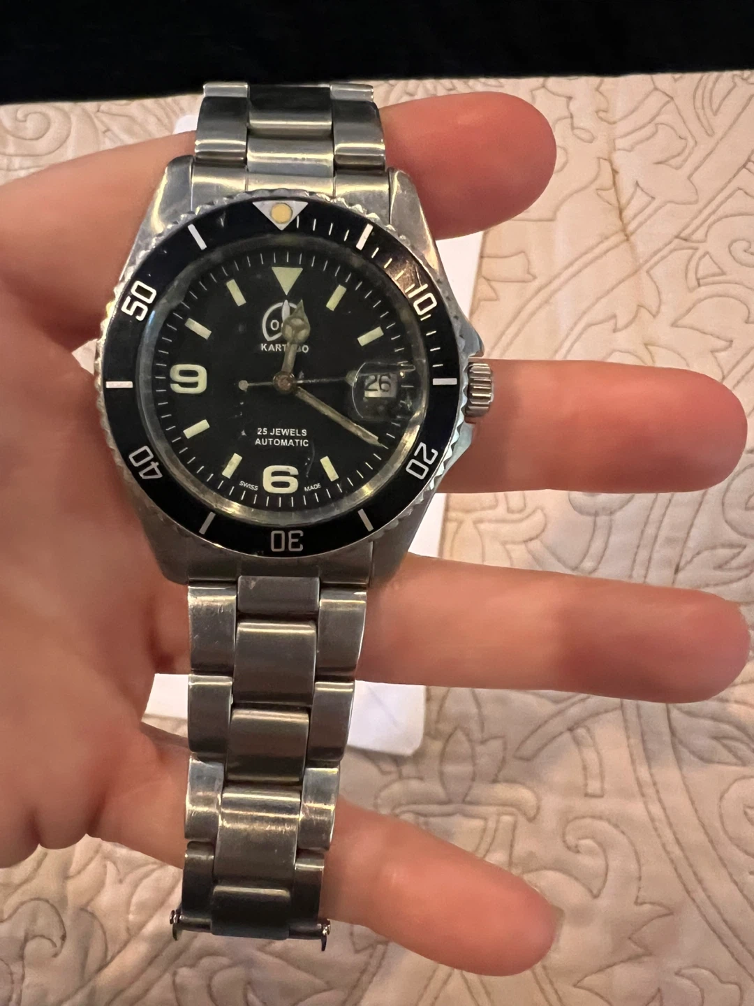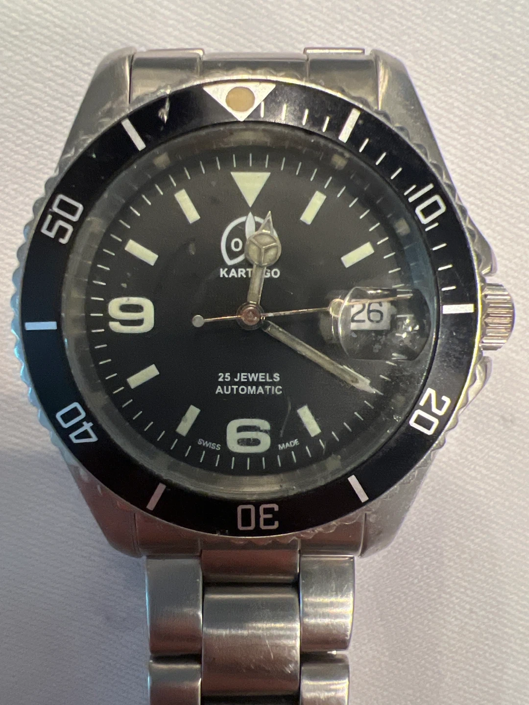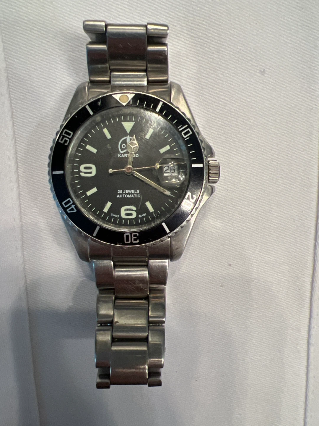 60Selling a KARTAGO automatic watch. It features 25 jewels and a stainless steel band. Swiss-made watch with 20 ATM water resistance. There are some signs of wear, but over years of inactivity it’s no movement. Need maintenance. Long period of disuse no movement from years of inactivity. Or best offer
