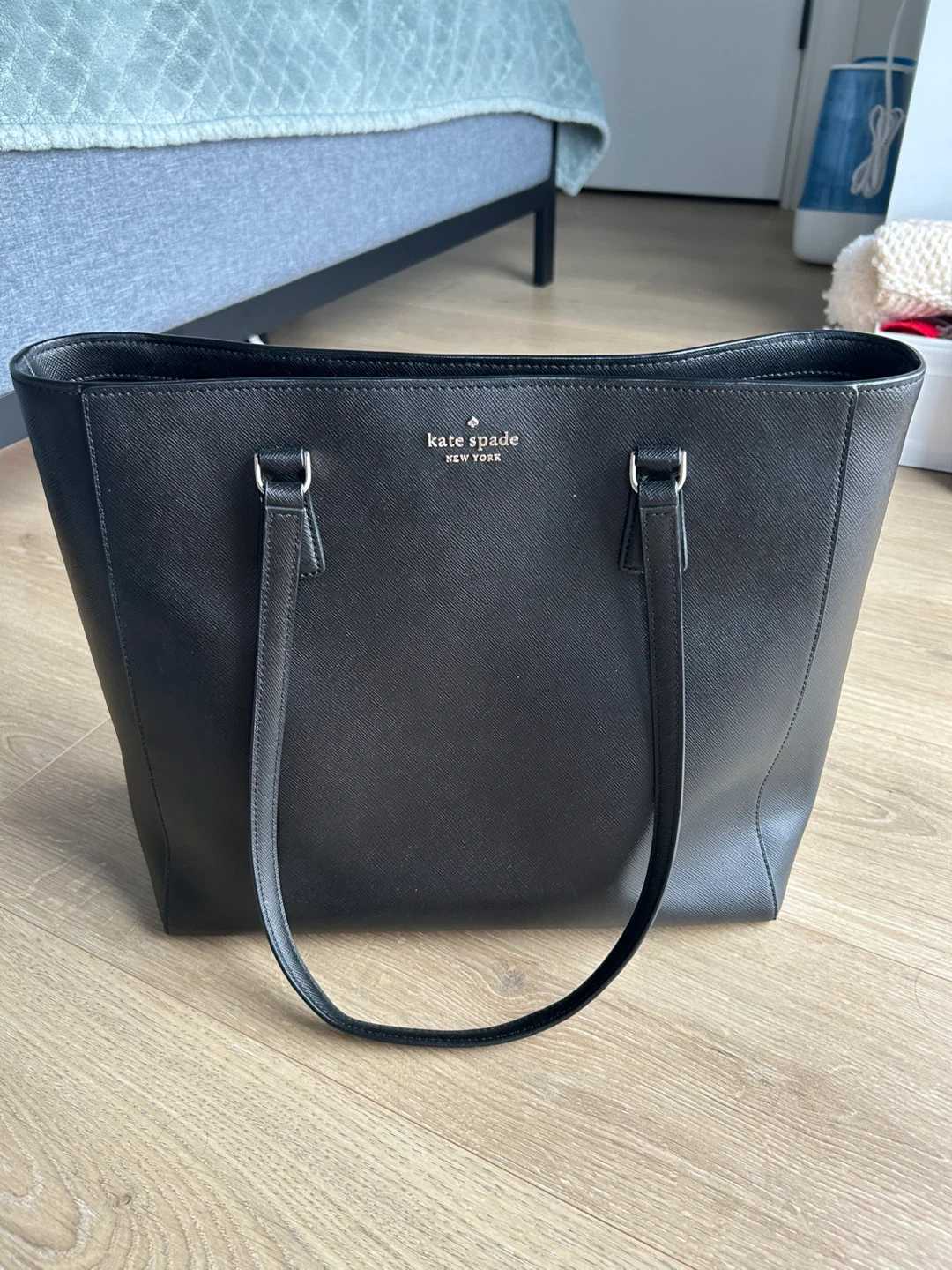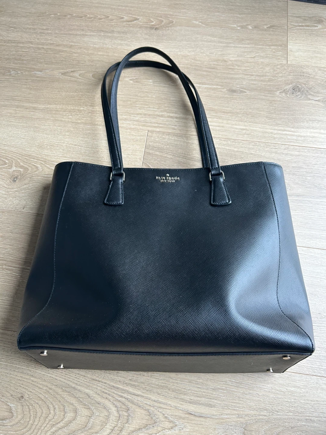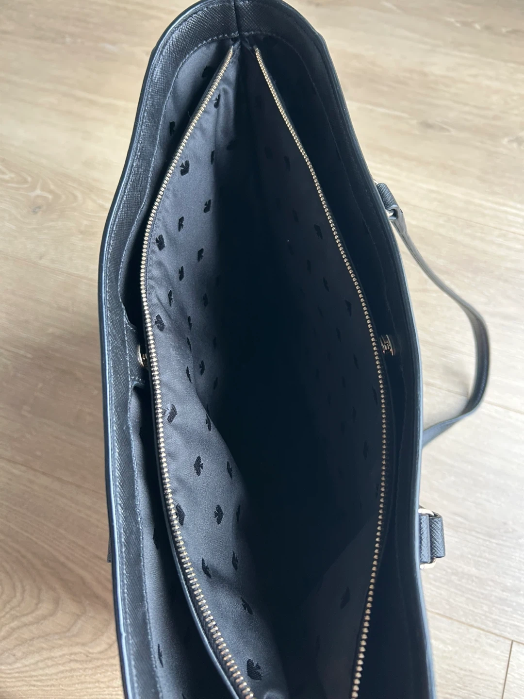 Selling a Kate Spade tote bag in black. It's in great condition and has a zipper pocket inside. Large size can fit laptops for everyday use! No flaws