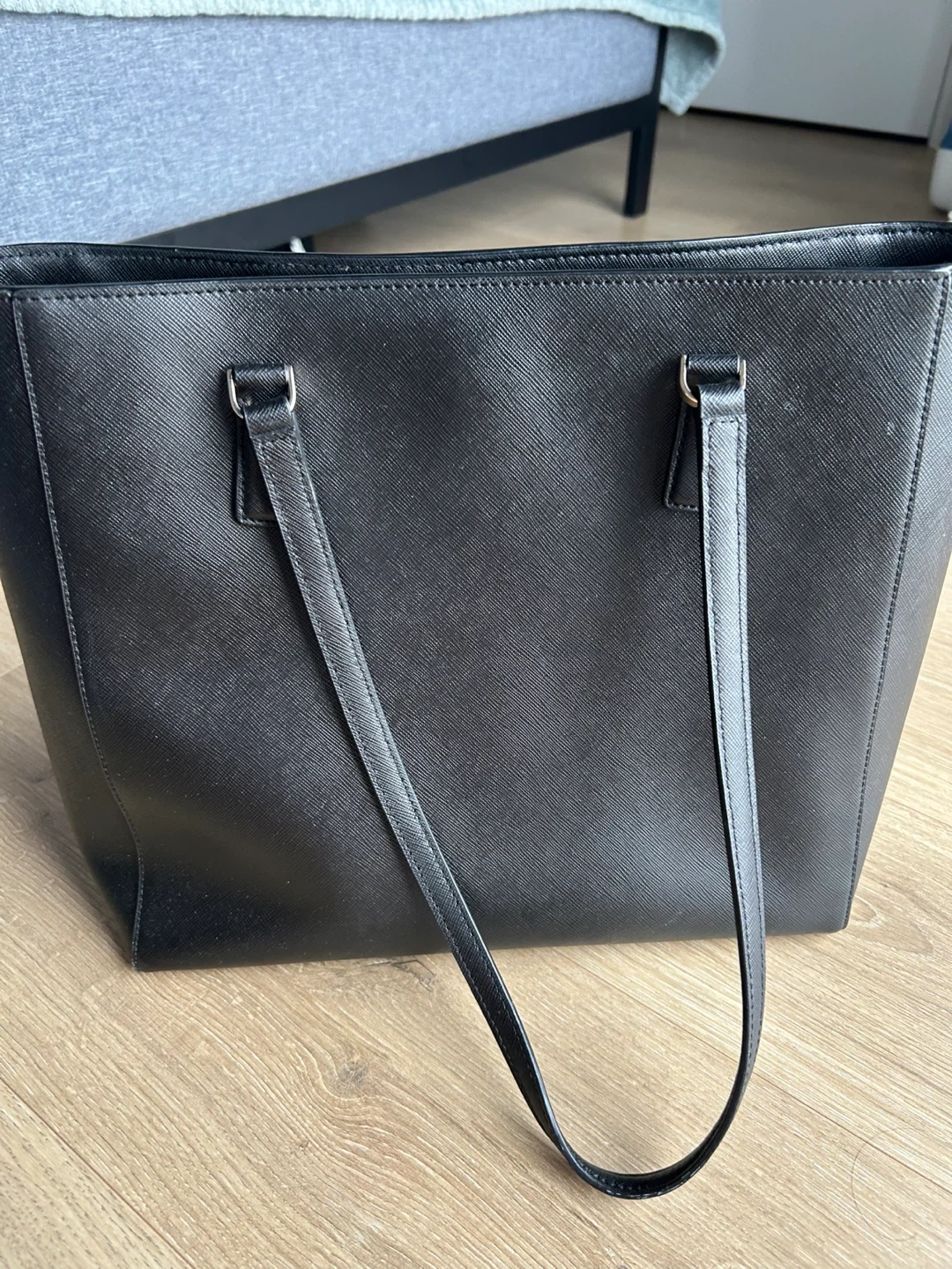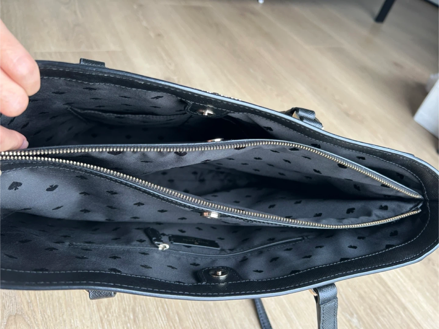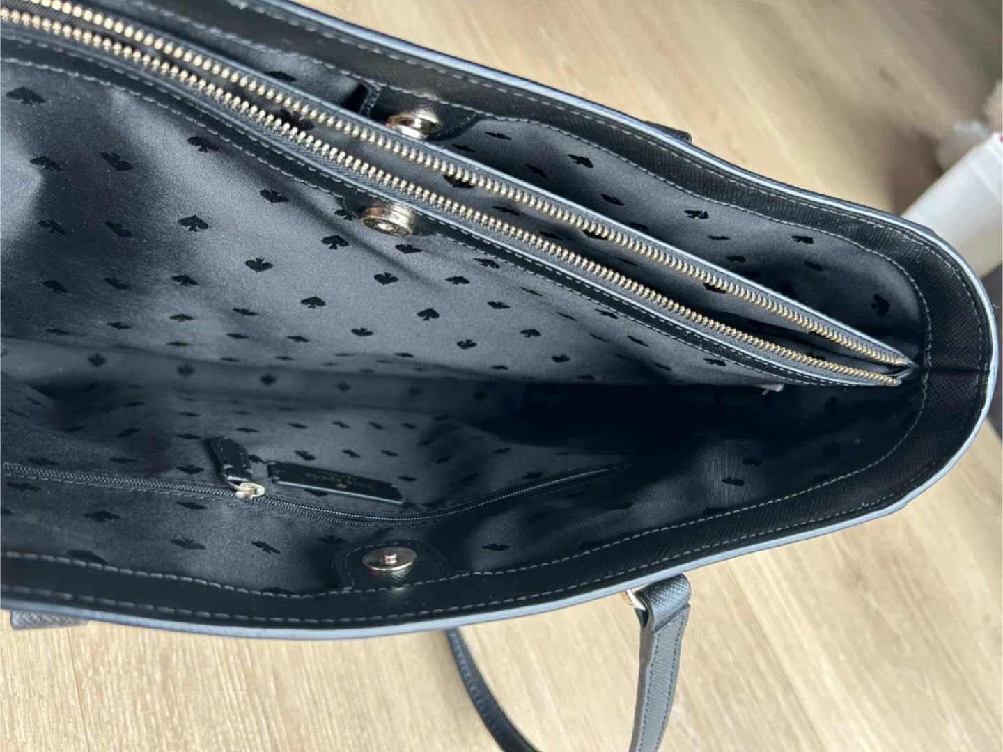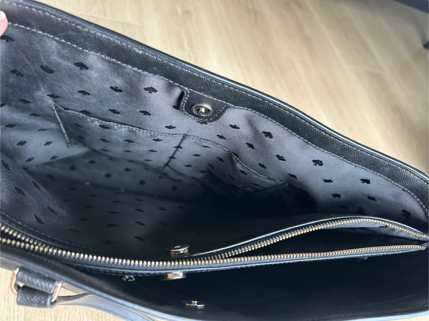 Selling a Kate Spade tote bag in black. It's in great condition and has a zipper pocket inside. Large size can fit laptops for everyday use! No flaws