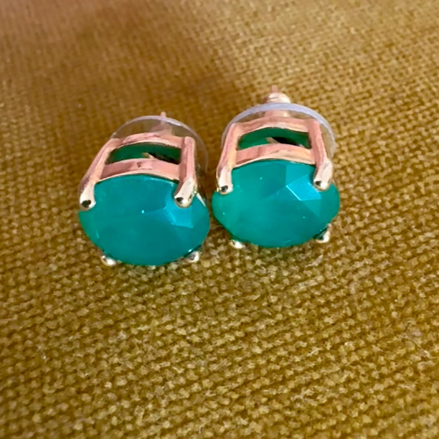 These are beautiful Kate Spade stud earrings featuring emerald green stones and gold accents. The color changes with the light (see both photos). They are in great condition and ready to add a pop of color to your outfit!