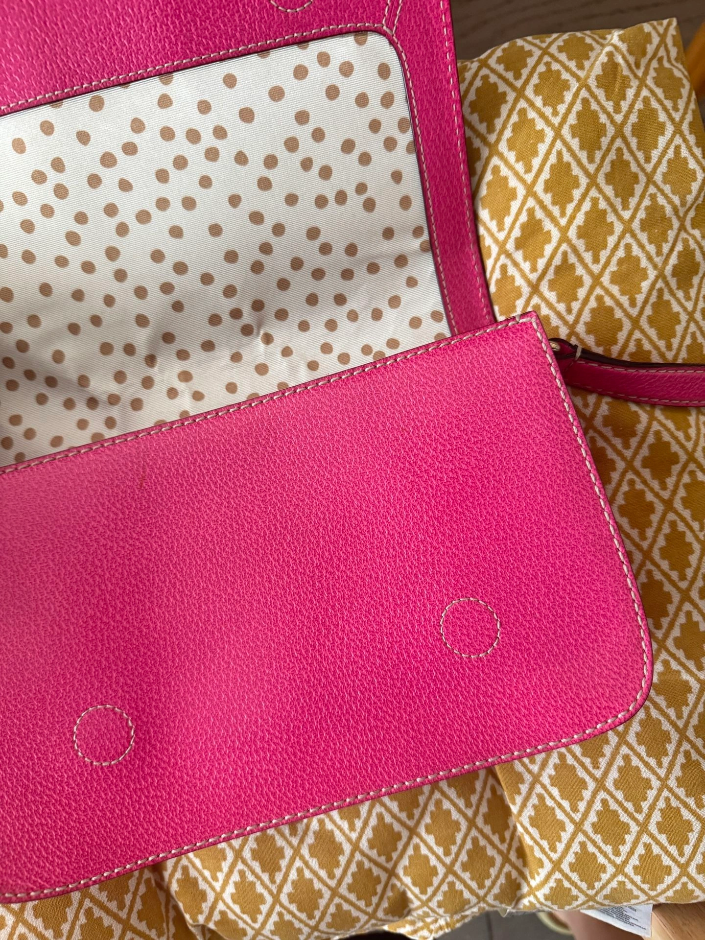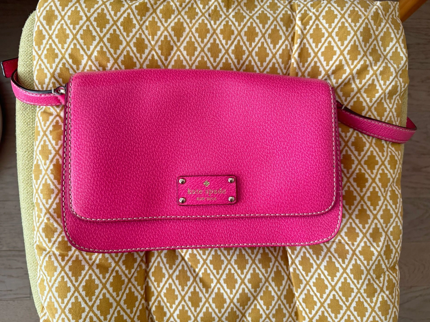 Add a pop of color to any outfit with this Kate Spade Wellesley Fynn crossbody bag in hot pink Baja Rose. Crafted from genuine pebbled leather, it’s both stylish and practical for everyday wear. Gently used, excellent condition (no major flaws). Perfect for daily errands or weekend outings — compact yet roomy enough for your essentials. Original Price: $248