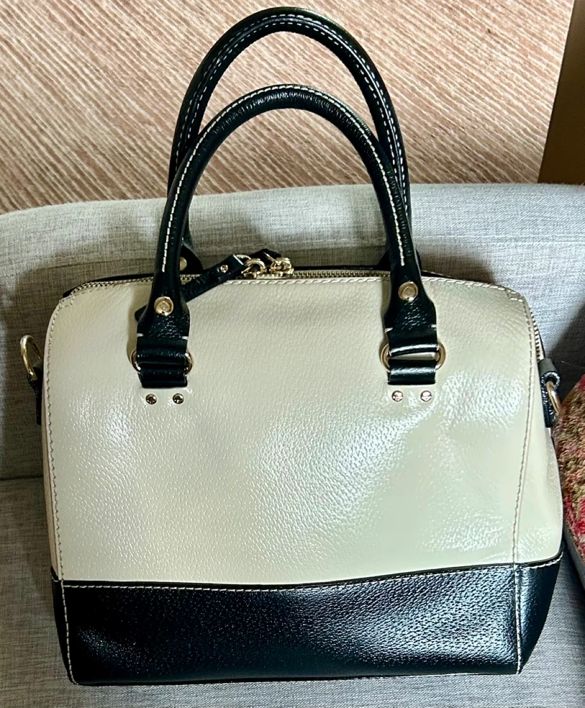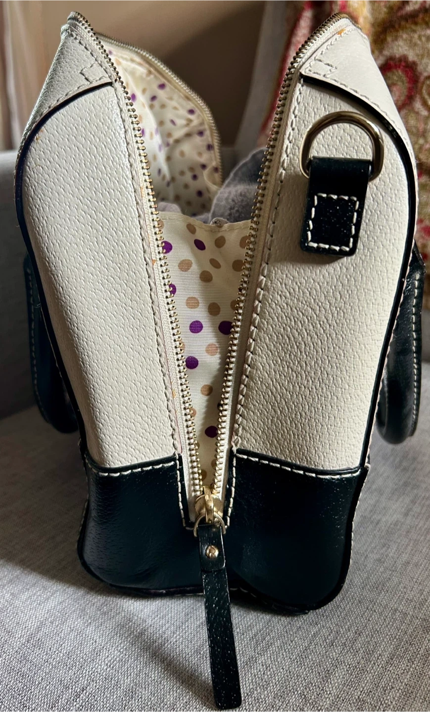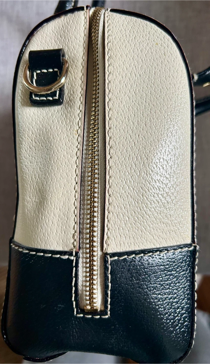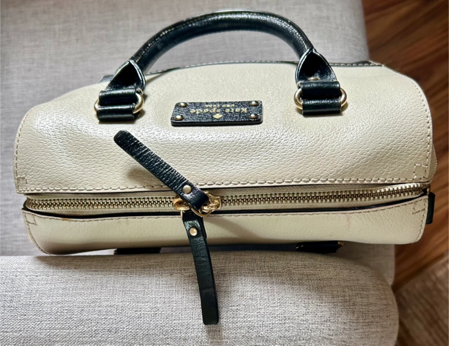 Selling a Kate Spade satchel bag in cream and black. It's in great condition and perfect for everyday use. The bag features a zip closure and has handles for easy carrying. A stylish and practical accessory!